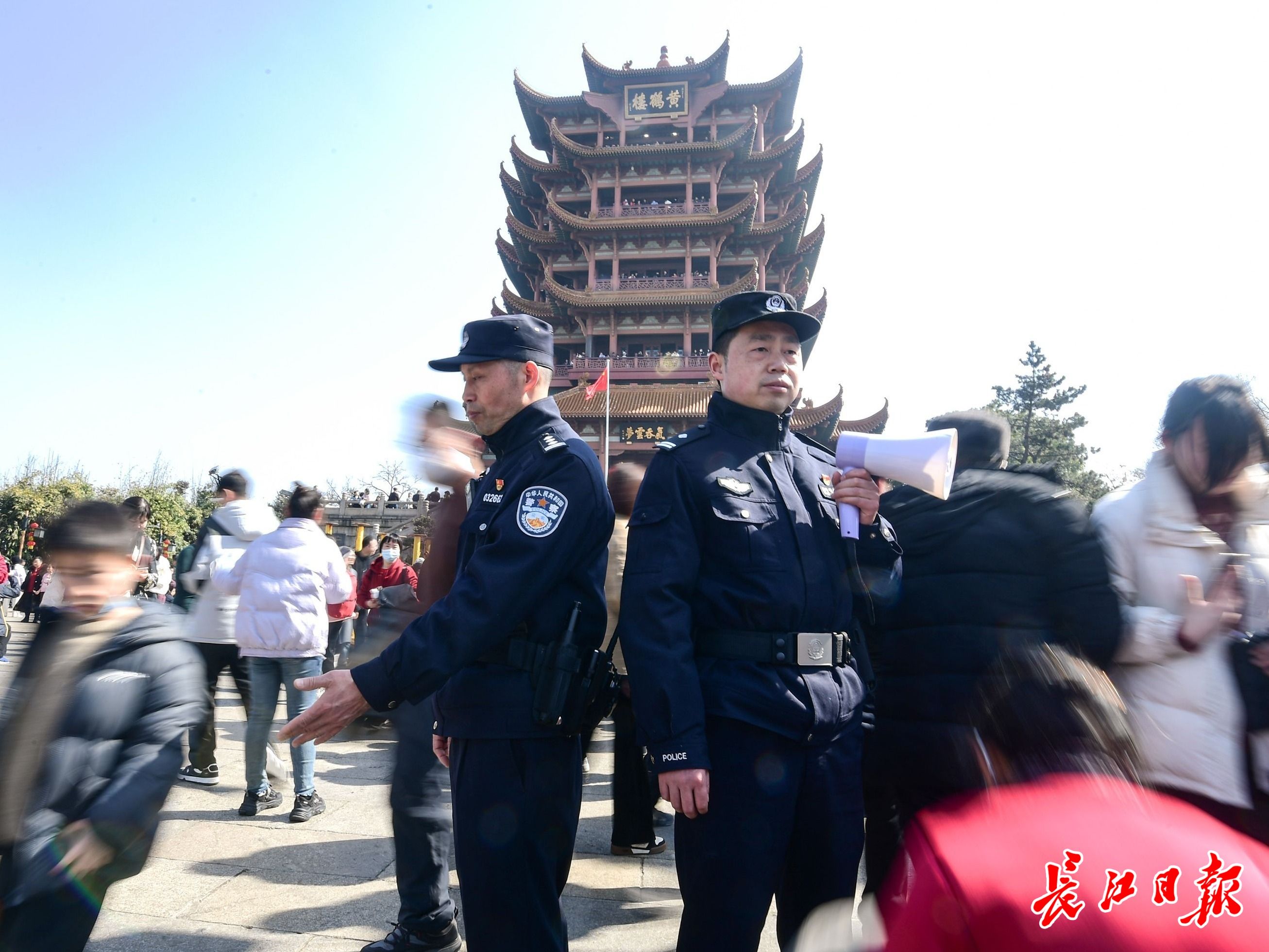 “两边通道都可以检票,大家照看好随身物品,一个一个进。”11日上午10时许,黄鹤楼景区西门前,黄鹤楼派出所民警周敏和冯小明站在准备入园的人流中,前者不断回复游客关于游园的问询,后者手持扩音器,反复播报相关安全注意事项。