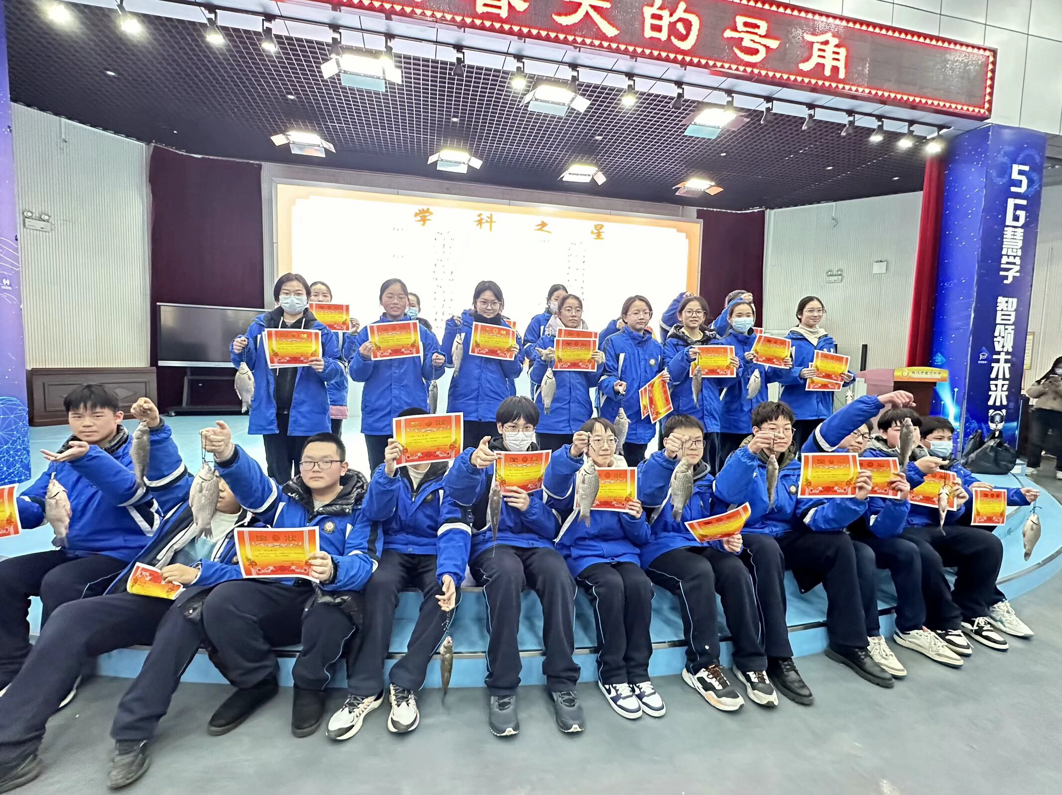 学生展示自己获得的鲫鱼奖励。