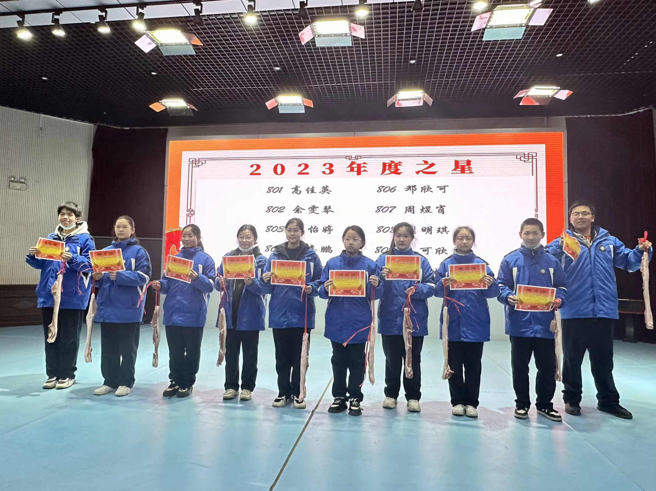 最引人注目的是,本次表彰打破了传统奖励形式,老师们准备了猪肉、鲫鱼、鸡蛋、南瓜、芹菜、萝卜、玉米、甘蔗、火龙果等多种食材作为奖品。让上台领奖的学生又惊又喜,全校笑声不断。“不用的食材代表着不同的祝福,既是对学生的认可,也寓意着滋养和成长,让奖励增添几分生活气息和实用性。希望他们向春笋一般节节攀升,不断努力。”李秋菊笑着说。