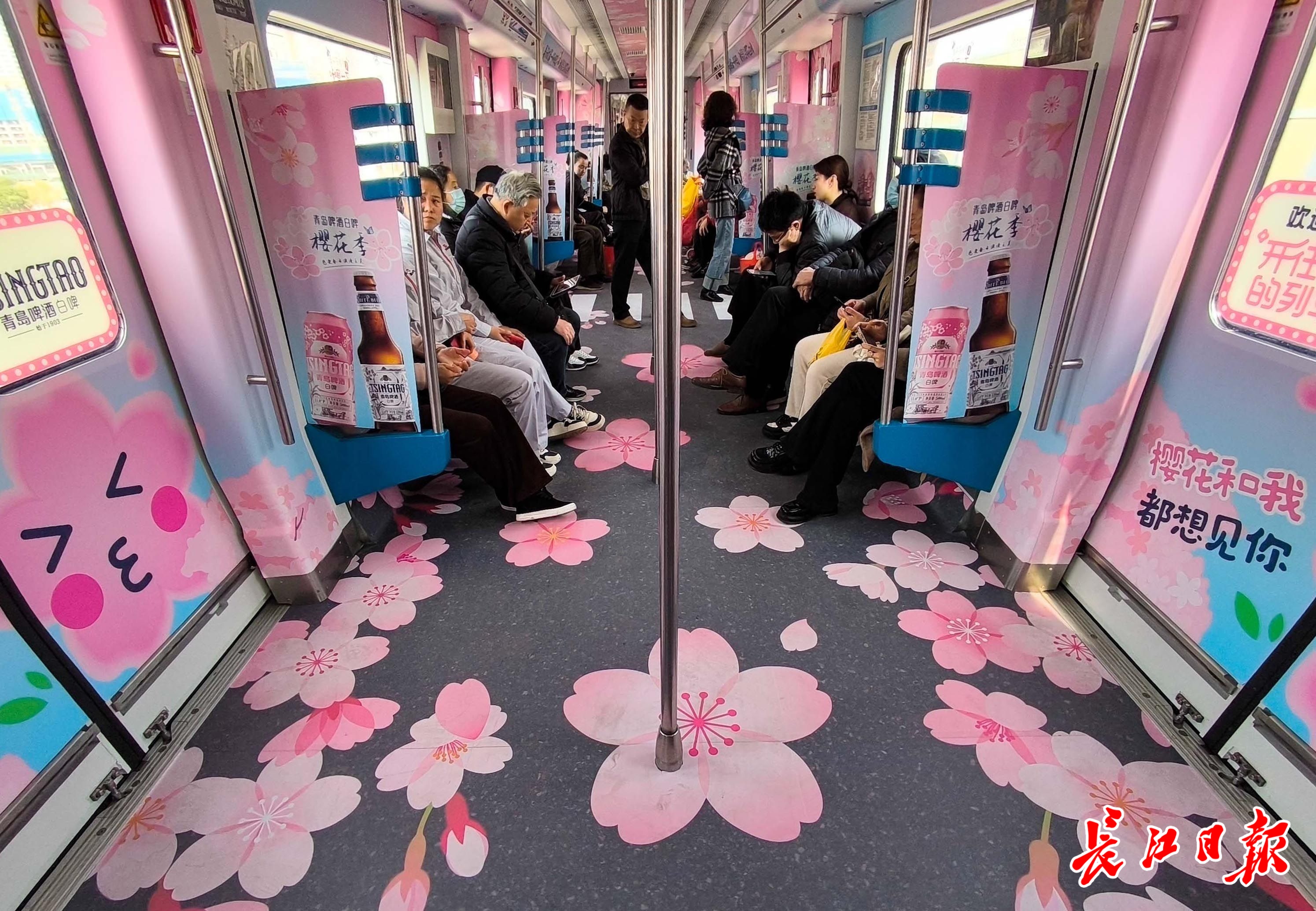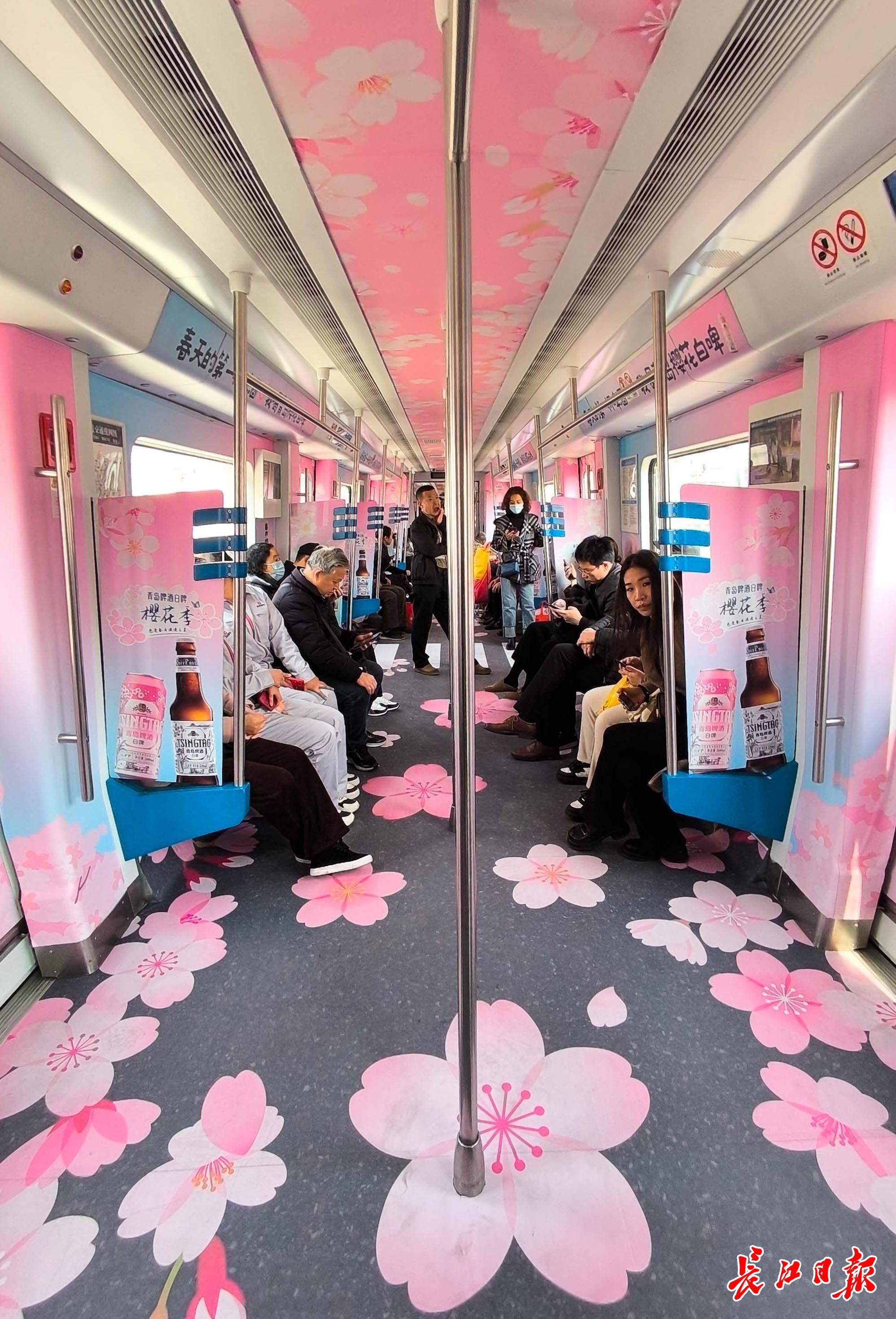 3月12日,武汉轨道交通1号线上出现了一列内外都用樱花粉色装饰的列车,车头处的车身上有“开往春天的列车”字样,车厢内侧贴满了粉色的“樱花”,走进车厢,春天的气息扑面而来。樱花季,来1号线与樱花列车偶遇吧。