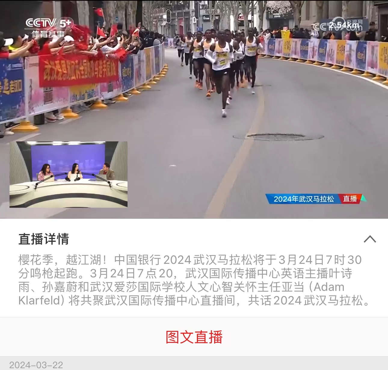 武汉是一座历史悠久、文化底蕴深厚的城市,结合汉马比赛镜头的实时更新,直播中三位主播向全世界观众详细介绍了运动员们经过的武汉三镇著名地标,“千古名楼”黄鹤楼、“珞樱”缤纷的武汉大学与春意盎然的东湖绿道。亚当(Adam Klarfeld)还提到,武汉的桥梁也特别有名,自己学建筑的朋友还专门发来消息说想亲眼看看武汉的长江大桥。