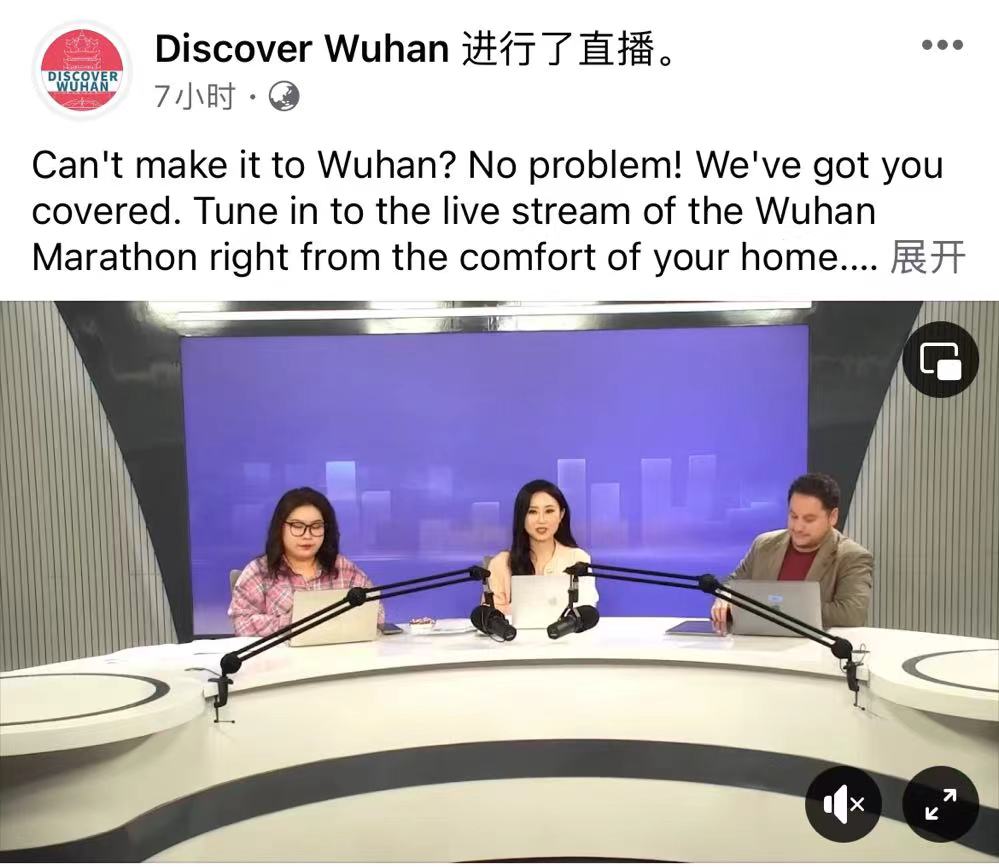 在长达近两个半小时的直播中,三位主播用英文向观众介绍了本次武汉马拉松的路线流程、补给储备、医疗安排等,为参赛者与观众提供全面的赛事信息。同时也进行了一些赛事科普,例如“为什么职业马拉松选手会选择戴墨镜长跑”等趣味问题,直播间氛围火热,弹幕屡屡刷屏。