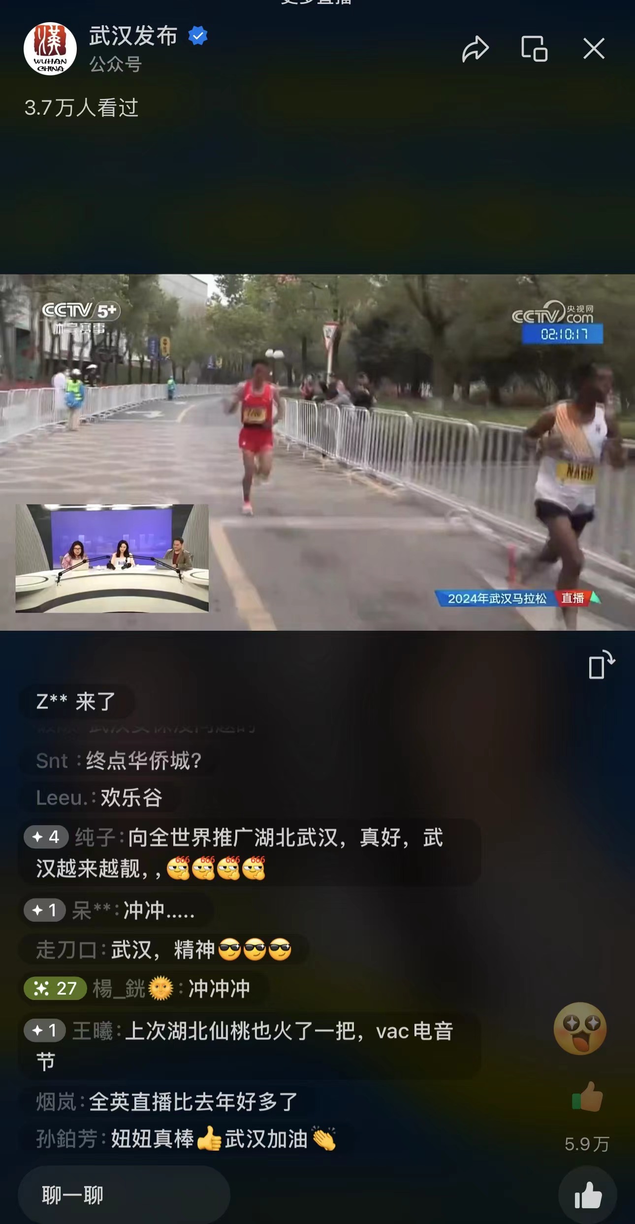 此次汉马全英文直播在武汉发布视频号、长江日报大武汉客户端、海外账号Discover Wuhan等平台同步发起,共吸引了超8万名观众在线收看。