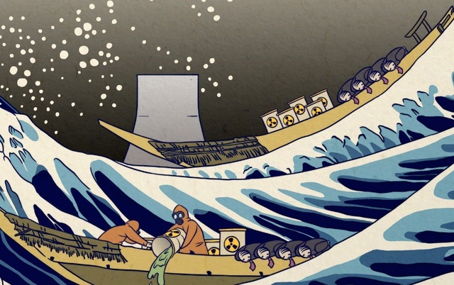 象征着日本的富士山变成了一座高耸的核电站烟囱;本是载着船员搏击风浪的舢板,如今载着一桶桶充满着放射性元素氚的核废水,数名被防护服紧紧包裹的工作人员,将它们一桶接一桶地倒进大海。