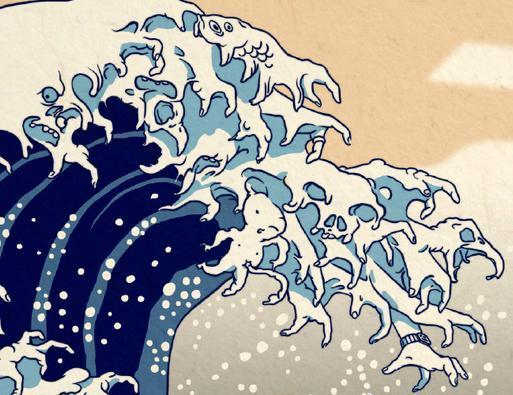 波涛汹涌的海浪在画师的笔下,化成了变异的海洋生物、畸形的婴儿和人类手指。