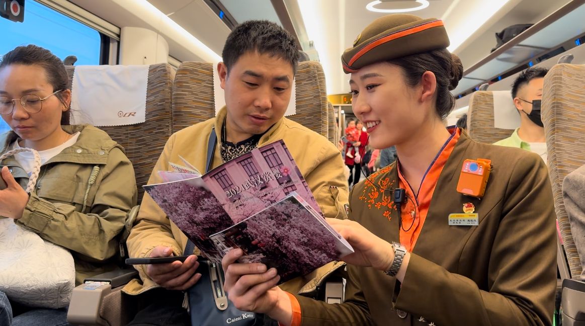 图为武汉客运段列车乘务员在G3458次列车上向旅客推荐赏樱路线。通讯员徐雅婷 摄