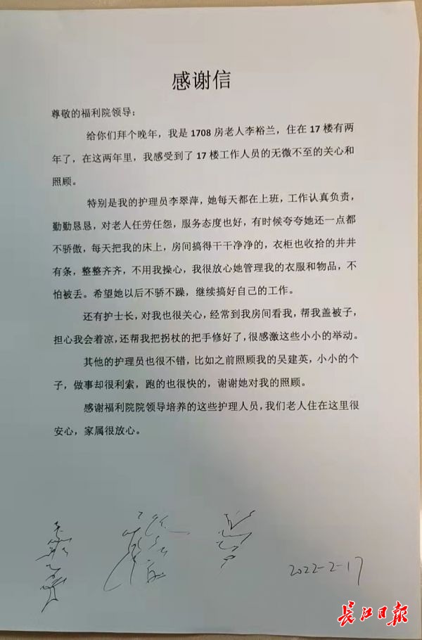 “我感受到了无微不至的关心和照顾”,李裕兰在信中提到,服务自己的护理员李翠萍一直任劳任怨,悉心照顾自己,老人爱干净,护理员便把她的房间保持得格外干净、整洁。李裕兰还说,当时失智区的班长何欢总是来到房间看望她,担心她着凉,不时进来帮她盖好被子,“很感激这些小小的举动”。老人感慨地说,住在这里安心,家属也很放心。在感谢信整理好后,李裕兰老人坚持在末尾歪歪扭扭地手写下自己的名字。看到感谢信时,护理员们表示,“平日的付出被老人记在心里,让我们特别温暖”。