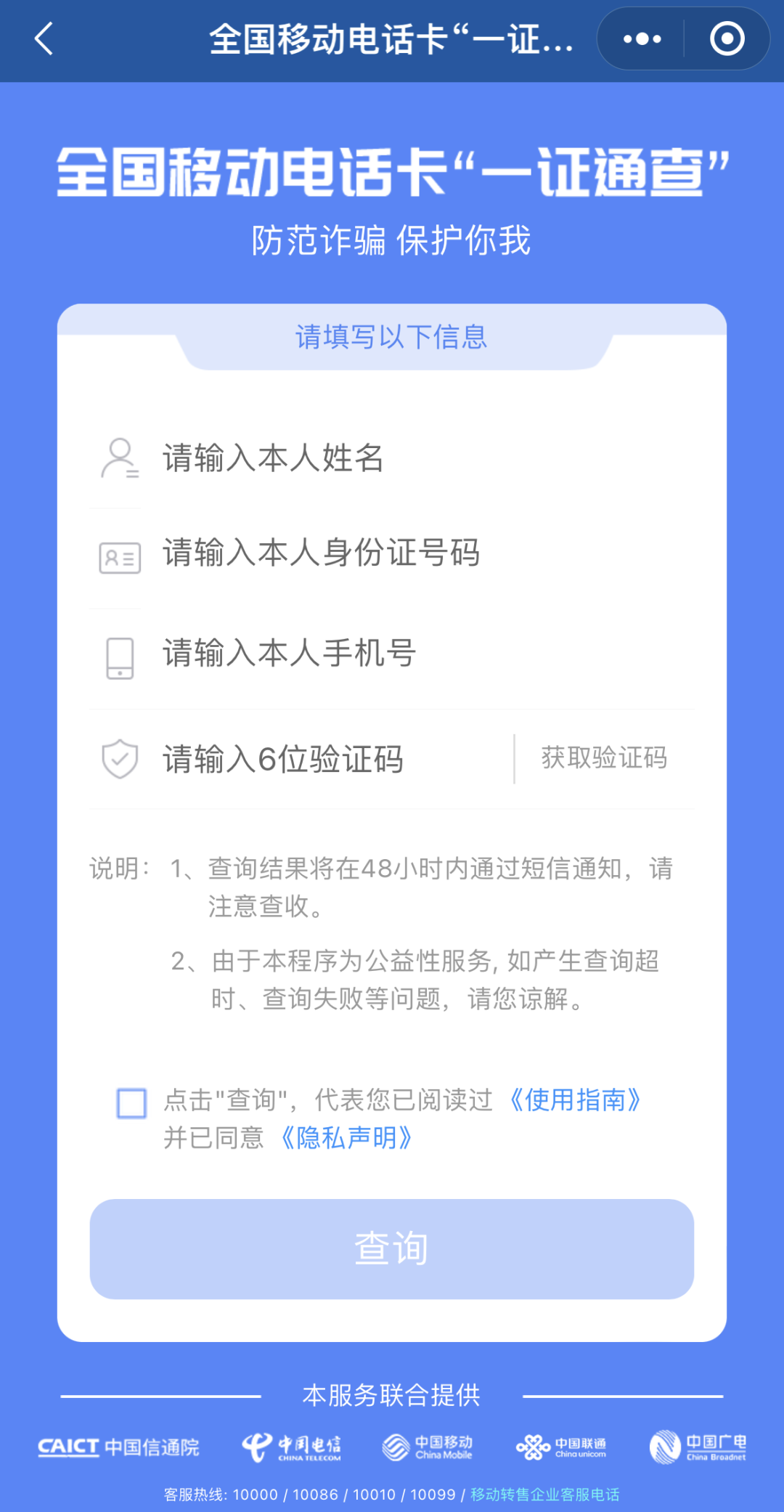 填写姓名、身份证号码和手机号码,核验通过即可预约查询名下所有移动电话卡数量。48小时内,专用短信端口10699000会向预留的手机号码反馈结果!