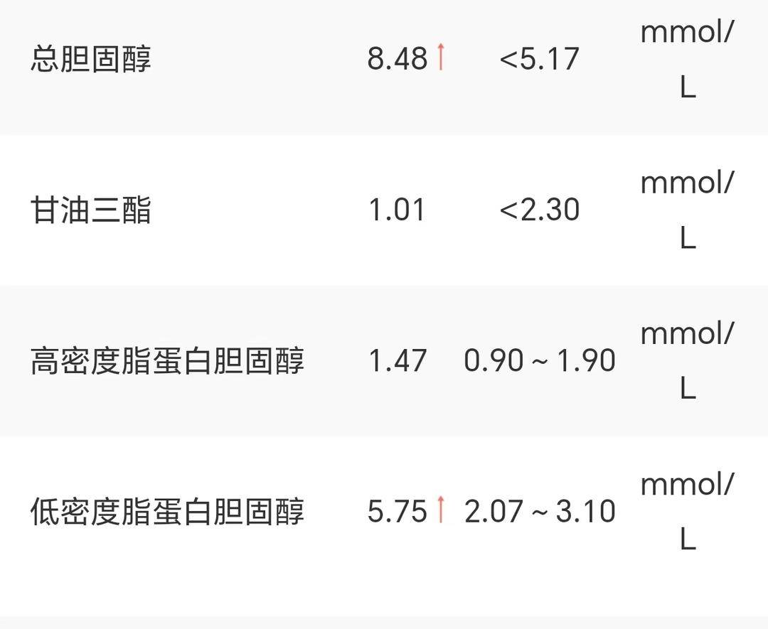 令王女士焦虑的两个“箭头”是这样的:总胆固醇8.48mmol/L(正常数值应小于5.17mmol/L);低密度脂蛋白胆固醇5.75mmol/L(正常范围应为2.07~3.10mmol/L)。