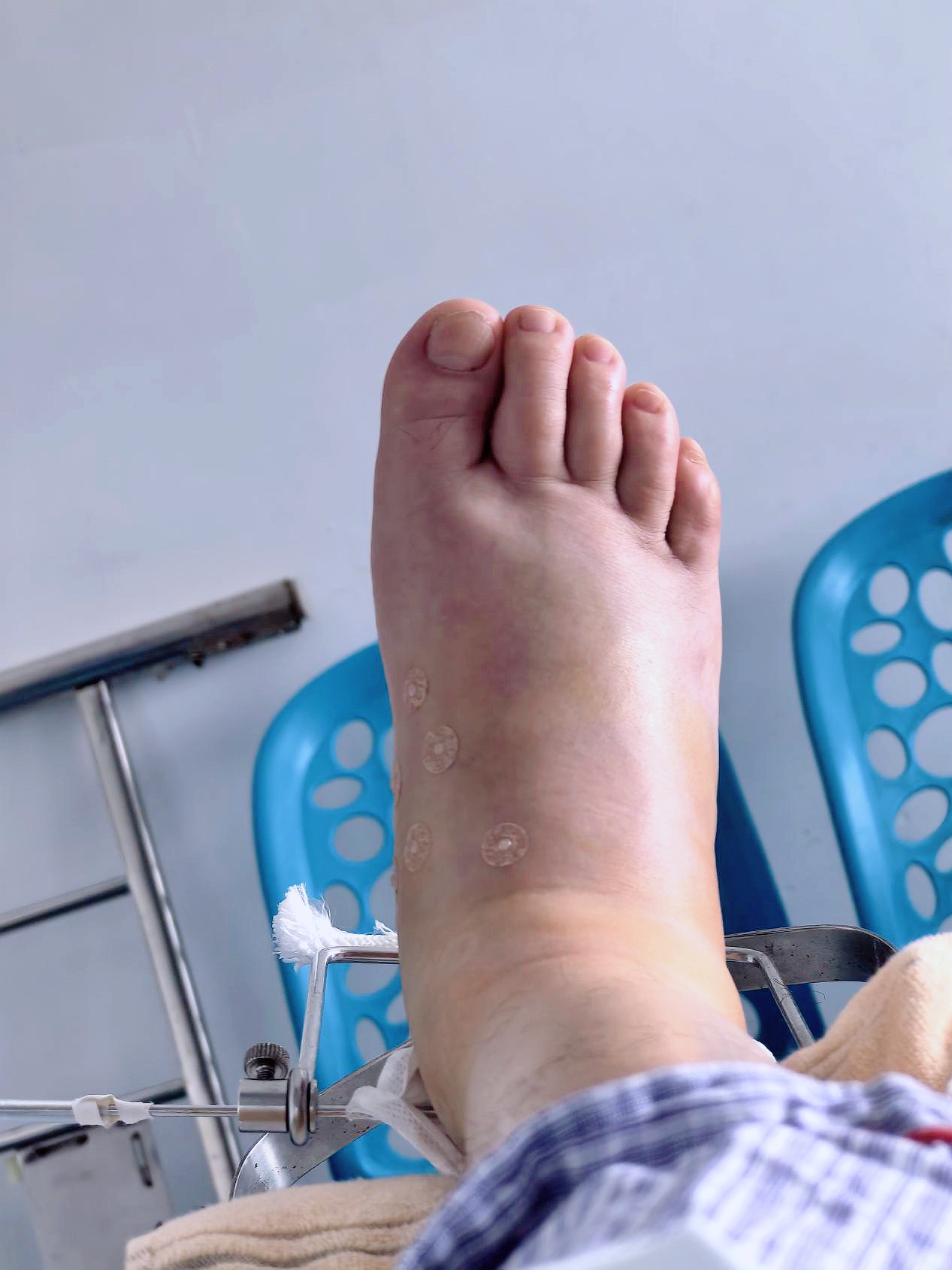 牵引后秦先生的“歪”脚被扳正了,但仍肿胀异常。