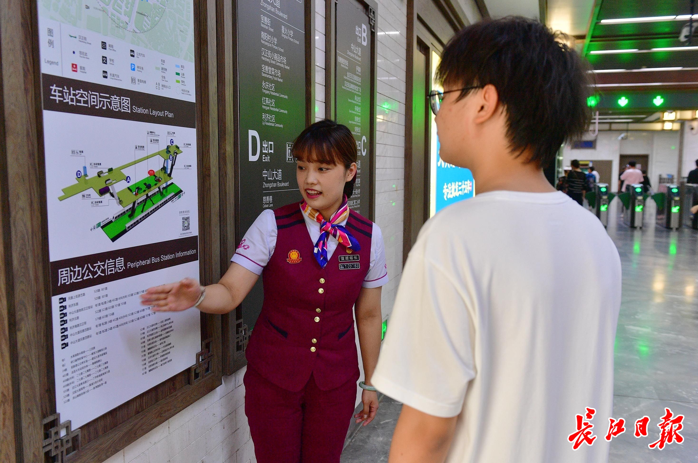 田霄媛在车站内为乘客指引出行路线。记者李永刚 摄