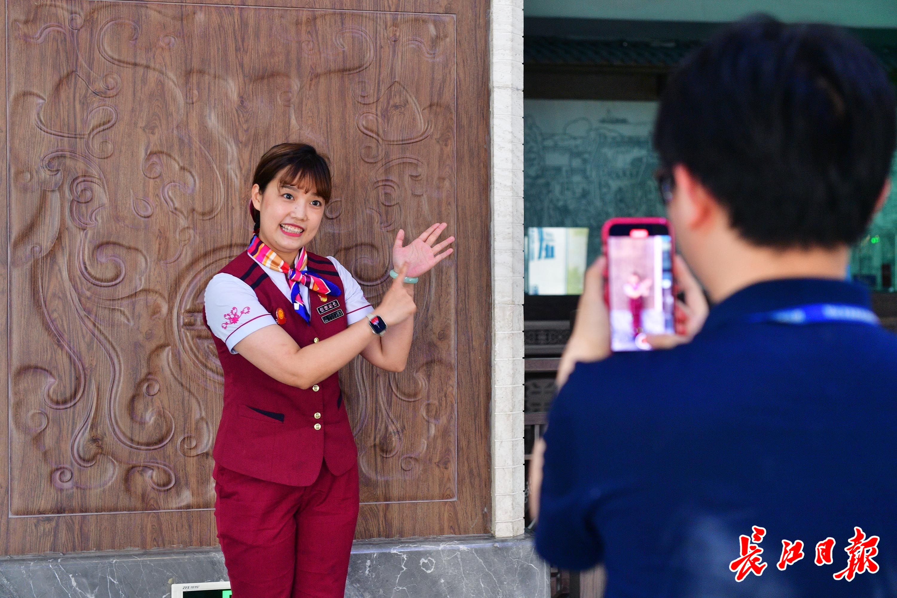田霄媛和同事在车站内拍摄视频。记者李永刚 摄