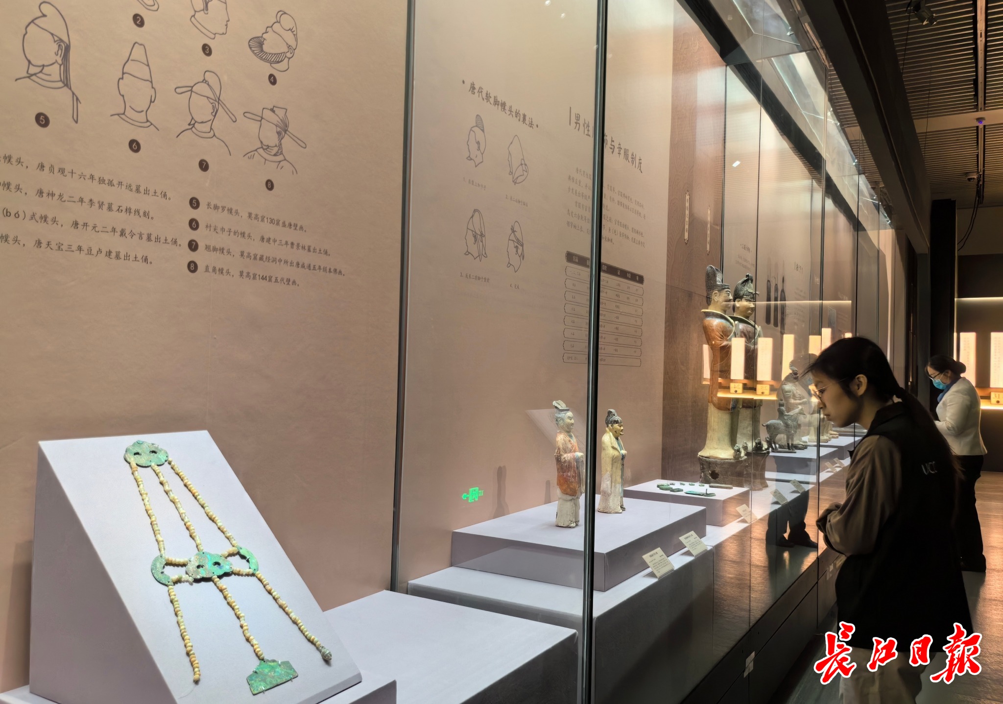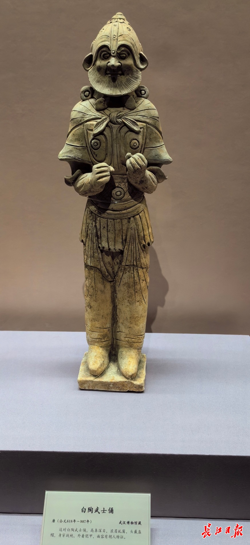 长江日报记者在现场看到了武汉博物馆珍藏的唐朝文物,其中一件唐朝箕形陶砚,质地润泽细腻、轮廓简洁流畅、造型稳重、素朴大方,体现了唐砚的实用功能;另一件白陶武士俑,产于公元618—967年,高鼻深目、浓眉虬髯,头戴盔帽,身穿战袍,外着铠甲,面容有胡人特征。