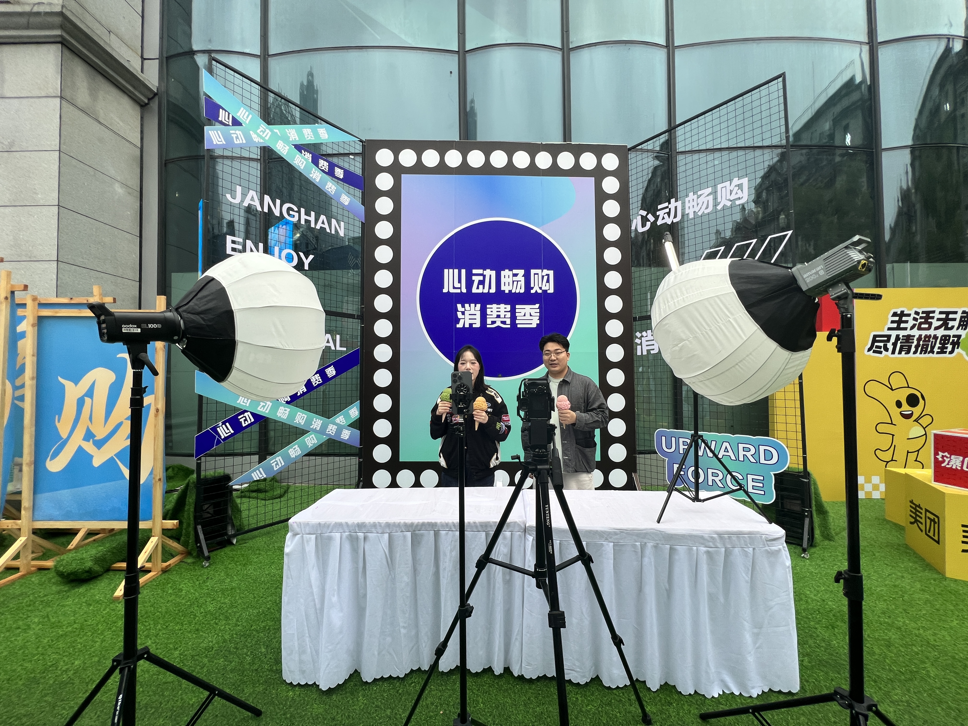 从4月26日开始,江汉区“心动畅购消费季”活动启动,美团、抖音和饿了么将直播间搬到了江汉路步行街,线下实景直播,引流推介武汉商户品牌。同时开设专属线上直播间,为市民游客放送福利优惠。