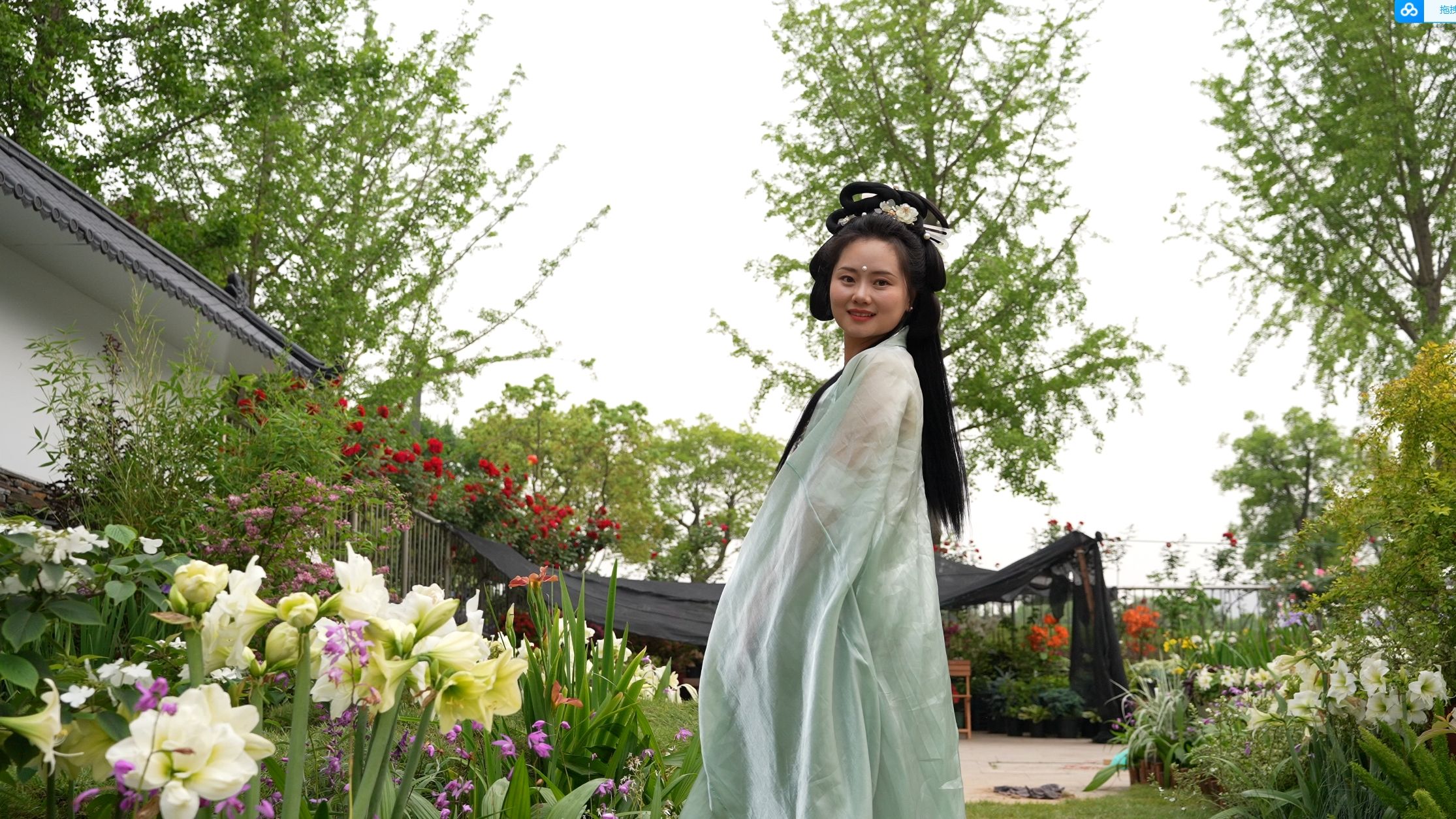 五位“花神”古装亮相世界花园大会推介“‘湿’情‘花’意”花园。(右起:欧克芳 王建强 聂超仁 梁玉婷 章晓琴)胡宁 摄