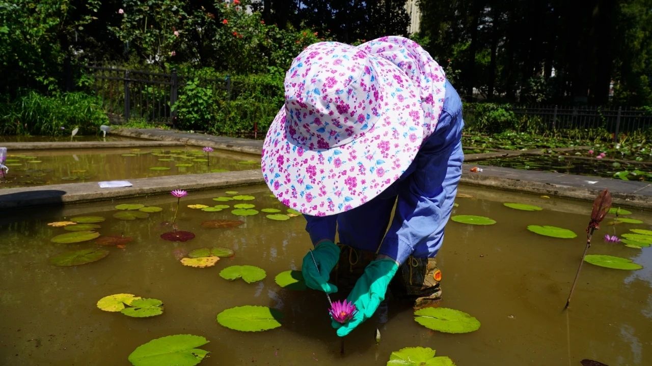 给睡莲杂交授粉既细致又辛苦。盛夏时节每次授粉,欧克芳都要头顶烈日,身着水裤,站在齐膝深的水池中弯腰操作。久而久之,她落下了腰椎病、颈椎病,脸部还得了日光性皮炎。