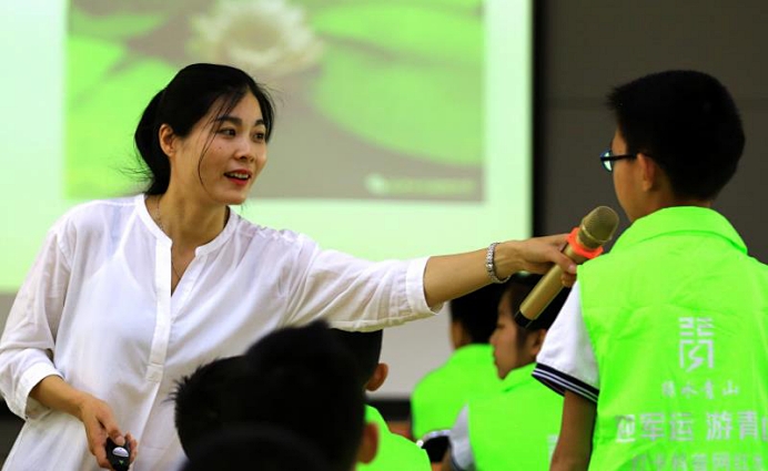 欧克芳(左一)为孩子们做睡莲科普。(资料图片)