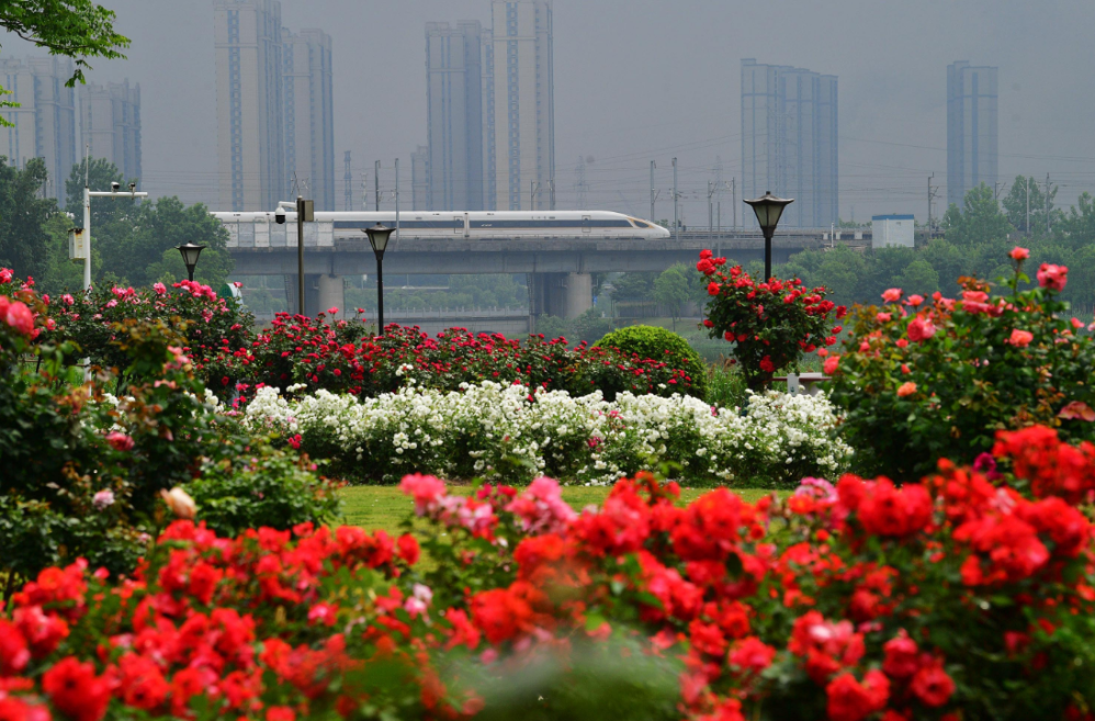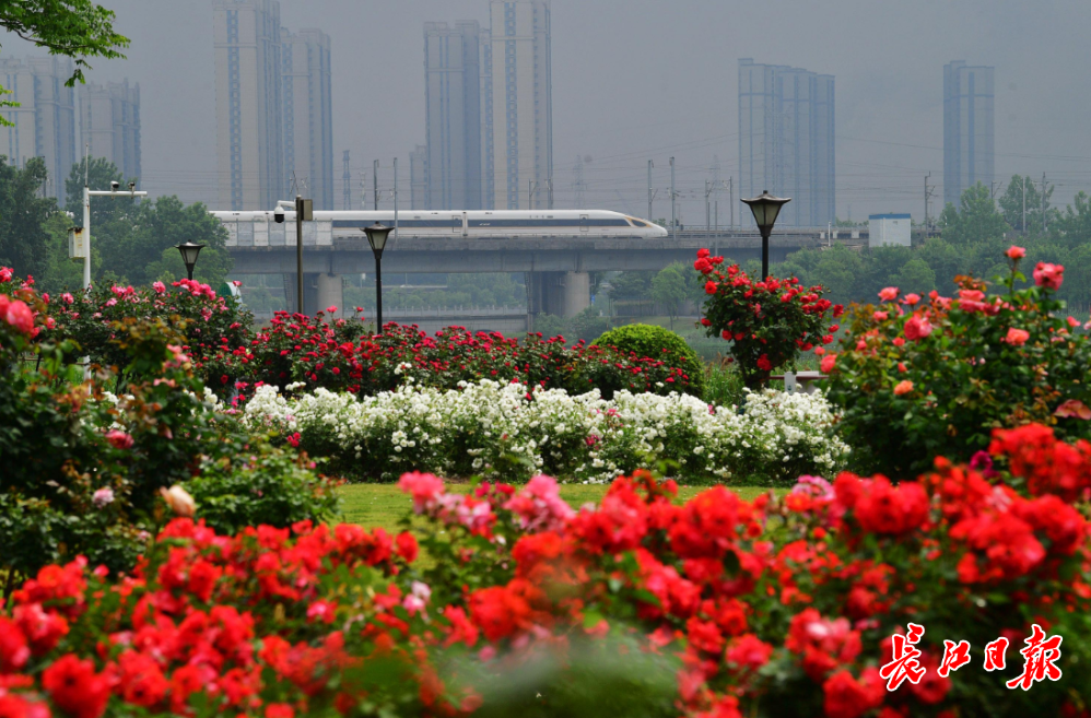 ● 洪山区杨春湖湿地公园月季园迎来盛花期,在此可拍下月季花与远处进出武汉站的高铁列车同框。详见>>>
