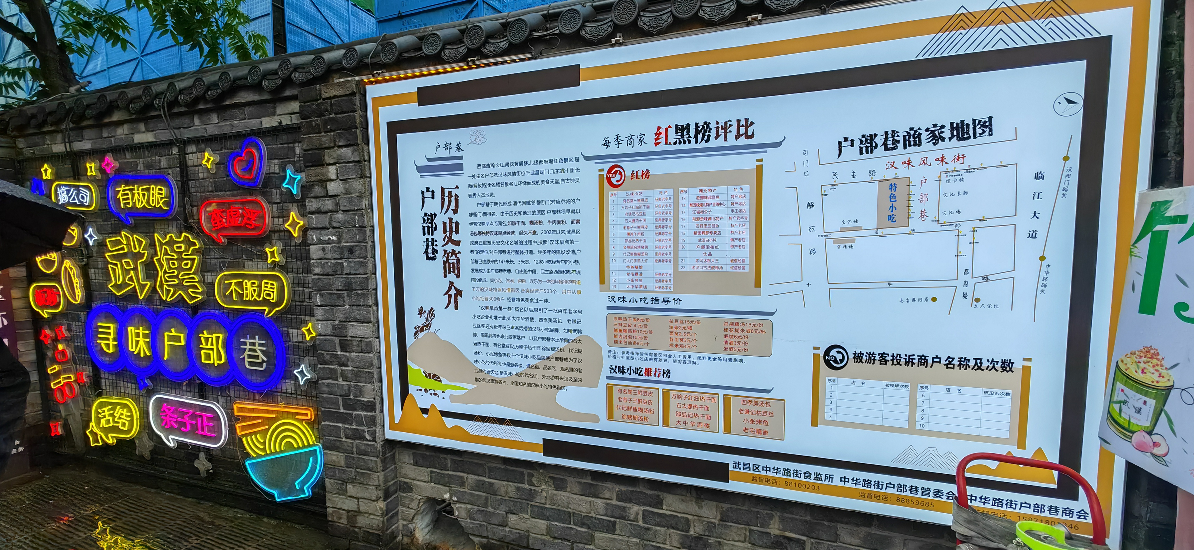 记者在民主路户部巷路口看到,文化墙上已张贴了“每季商家红黑榜评比”,其中红榜有万哈子红油热干面、老谦记枯豆丝、大中华酒楼、有名堂三鲜豆皮等老字号店铺,也有蛮到味武昌鱼、醉汉味湖北特产直销中心等特产店,还有江城杨公子手工店。在汉味小吃指导价中,原味热干面8元/份、三鲜豆皮8元/份、鲜鱼糊汤粉10元/份……吸引了不少市民和游客驻足观看,并纷纷点赞价格公示很贴心、透明。