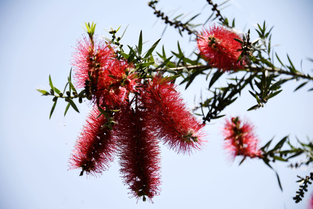初夏五月,我与朋友一起驱车来到武汉沙湖公园采风,在一赏花庭院区,第一次见到了几棵红千层树。仔细观察,此树不高,花在翠绿叶上,在众多公园中实属少见,但花开得艳丽,如火如荼,花形像一把把“刷子”,其颜色鲜红,飒爽美观,满枝吐焰,在蓝天映衬下绽放,甚为奇特,这也许就是“不一样的美丽”吧!