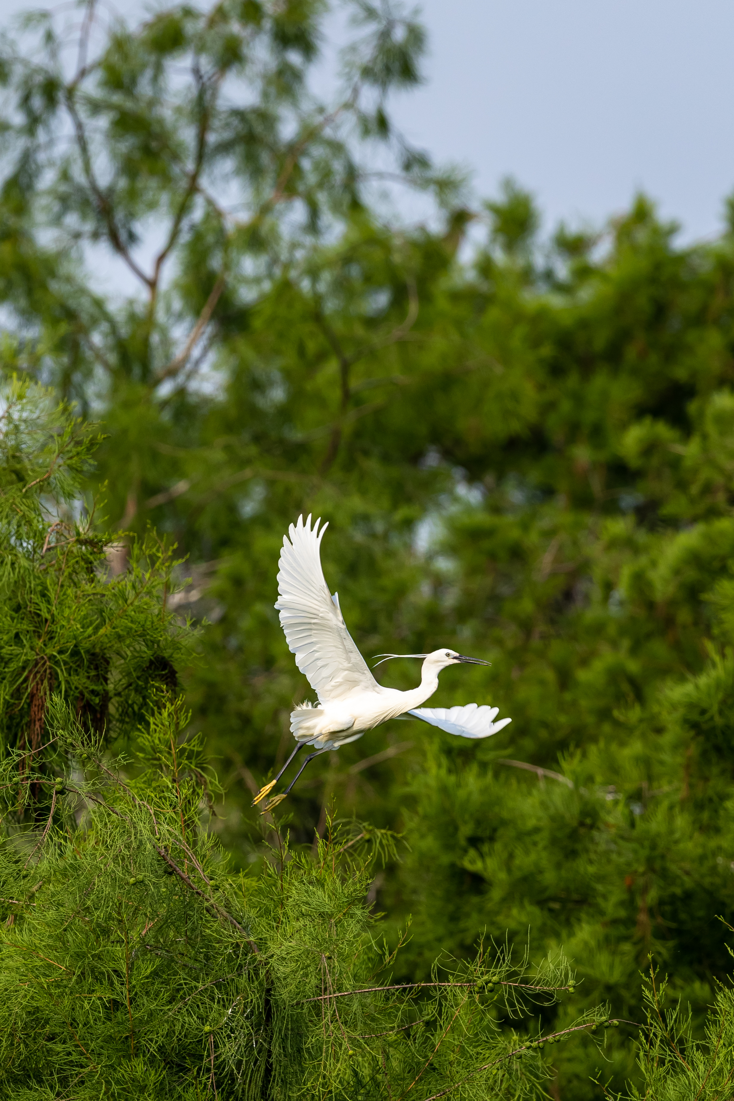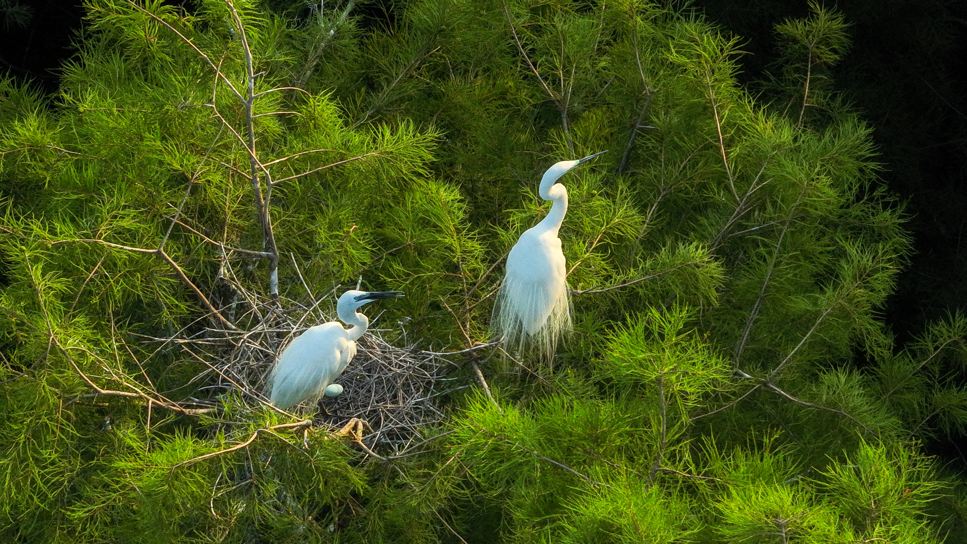 林间各种鹭鸟合群筑巢。