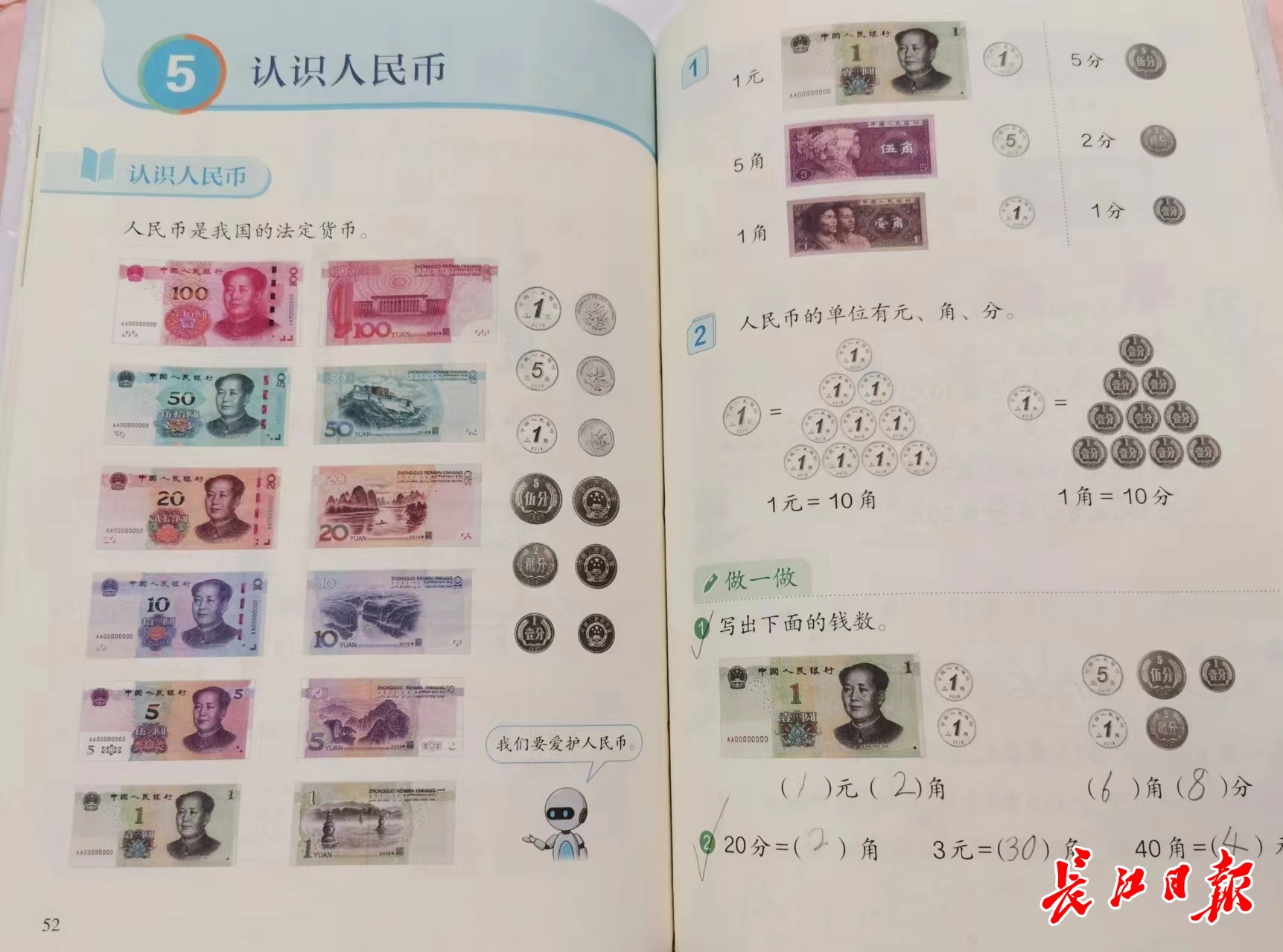 天一街小学数学教师聂鹏记得,他是1986年上小学,那时的数学课就有《认识元角分》的内容,老师还讲过人民币图案背后的故事。他2001年当老师,经历了至少3次课标和教材优化,《认识人民币》始终是教材中的重要一课。