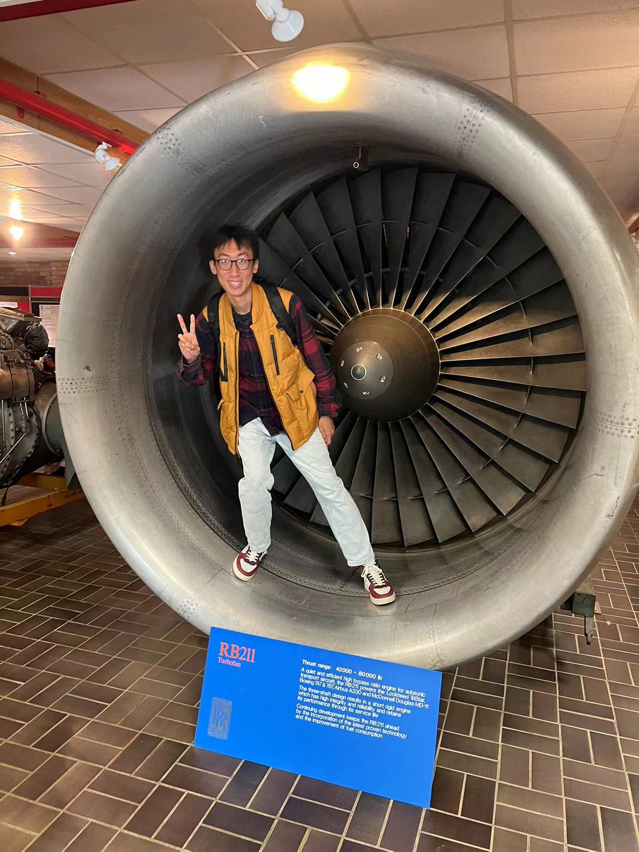 纸飞机资深玩家李官翰与航空发动机合影。(本人供图)
