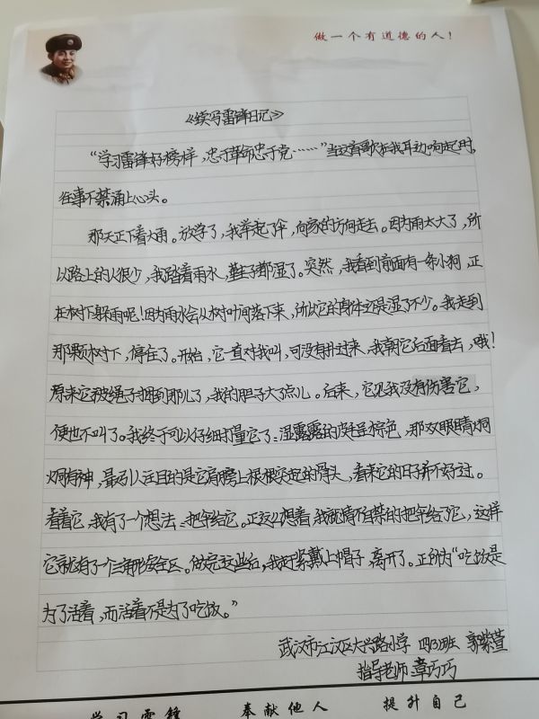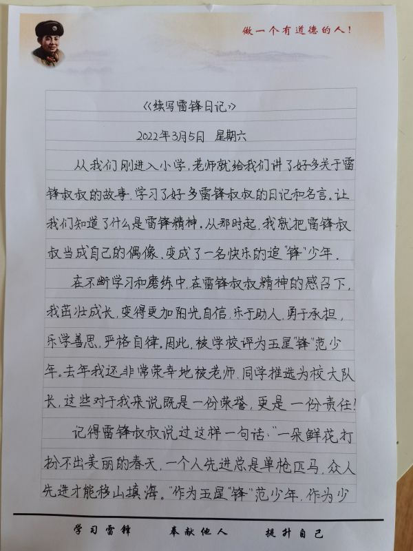 五(3)班的聂家琦想象,如果雷锋叔叔还活着,来到了现在的校园,看到同学们充满阳光朝气、努力学习,一定会感到很欣慰。他模仿着雷锋的语气写着:2022年3月4日,星期五,我来到武汉的大兴路小学,发现每个孩子都在认真学习,不懂的问题就请教老师,像‘钉子’一样钻研。我真想给大家点赞,国家正需要有‘钉子精神’的人才来建设。”