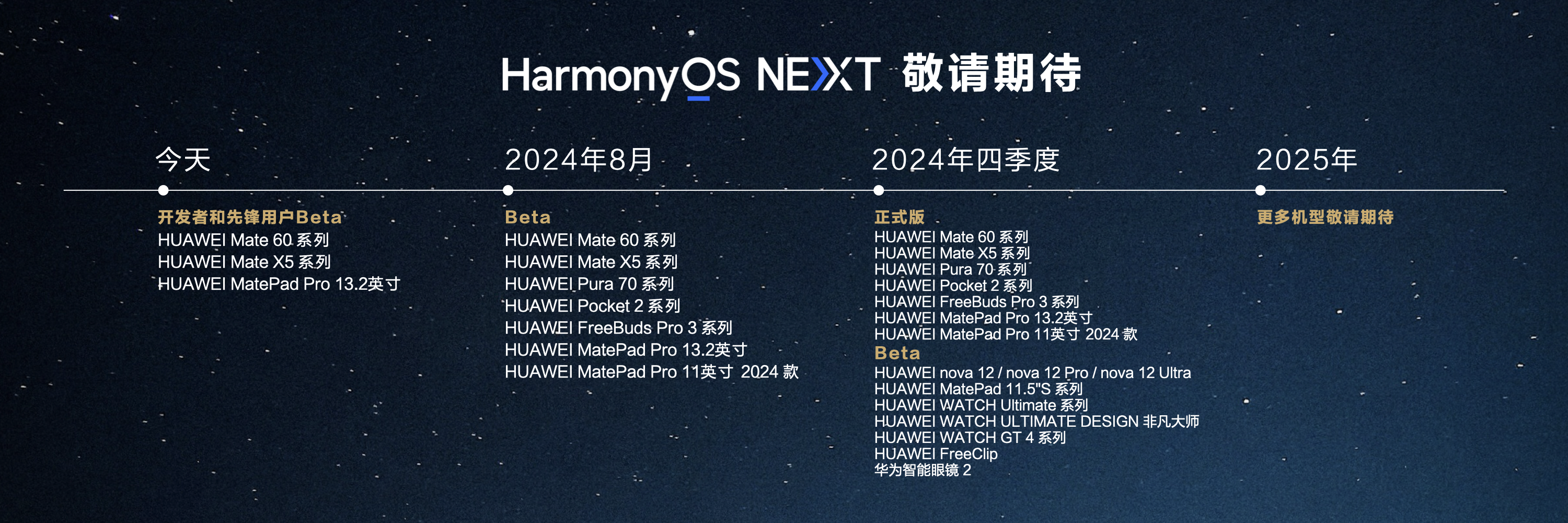 6月21日,在东莞举行的“华为2024开发者大会”上,华为常务董事、终端BG董事长、智能汽车解决方案CEO余承东正式发布“纯血鸿蒙”——HarmonyOS NEXT正式开启开发者Beta测试,同时今年第四季度将正式投入商用。其中,华为Mate60系列、MateX5、MatePad Pro 13.2英寸等多款设备即日开启升级。