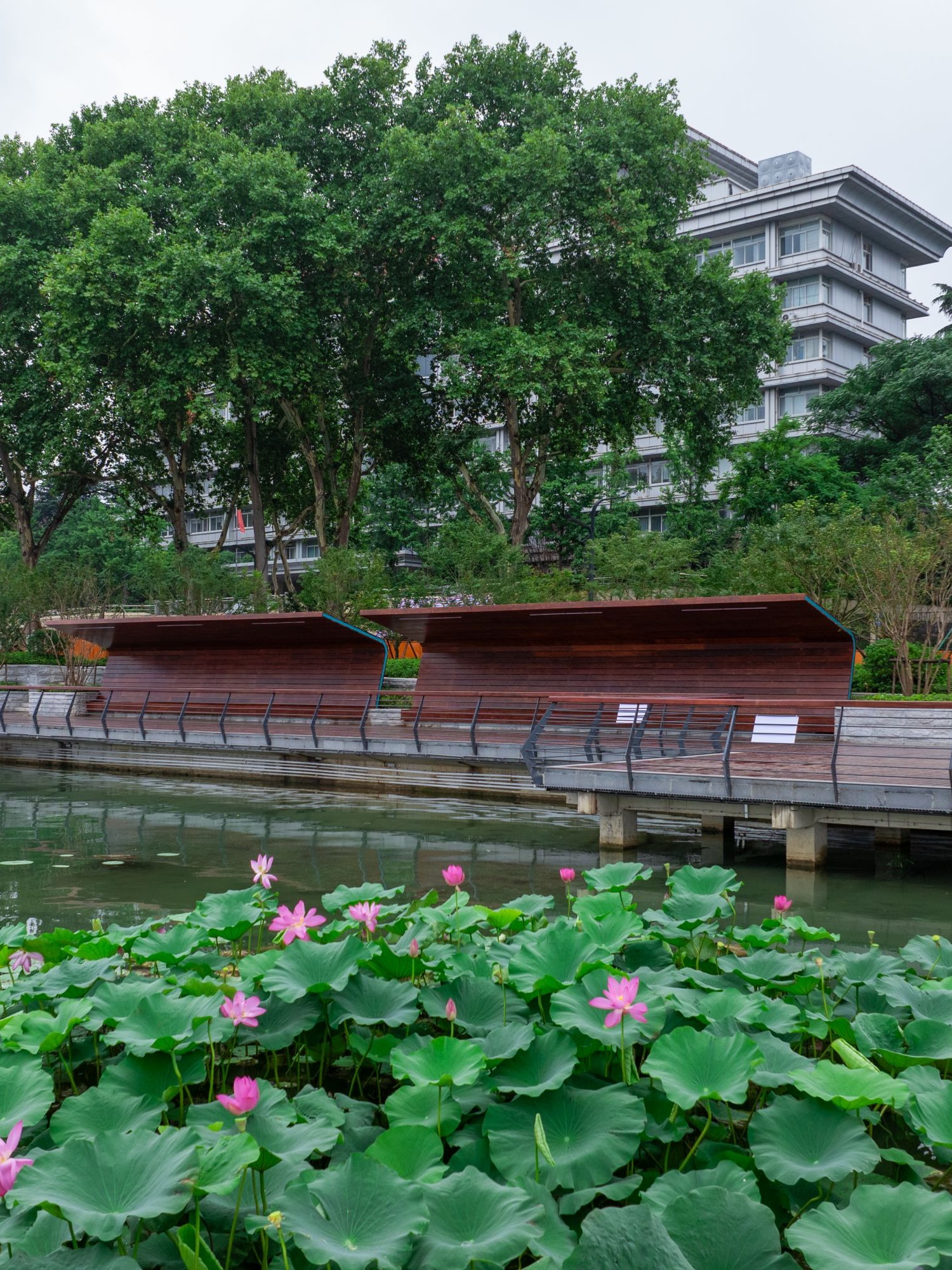 在水生所景点,改造前,这里只有简易的绿化和破损严重的铺装,既缺大树遮阴,也无休憩坐椅。改造后,利用场地高差,这里建造了两级观景平台:与马路平行的上层新修有花池,种植樱花等乔木,搭配百子莲等花卉,池沿兼具坐凳功能,变身可供休闲的小广场;更近湖边的下层,设置了观湖挑台和休憩廊架,主打滨水游赏。