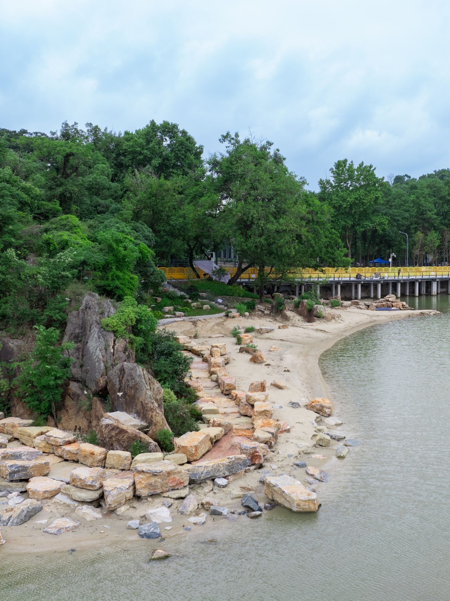 在天涯海角景点,半侧山伸入东湖的一个岬角,原本因岩石裸露、波涛拍岸,而成为武汉市民拍摄写真和寻幽览胜的网红宝地。为了保留这份别致的山湖野趣,同时增加景观效果,设计师环绕山脚布置了一批景石,营造出一条石上步道,既有利于游人行走,又避免了频繁踩踏山石损坏山体。