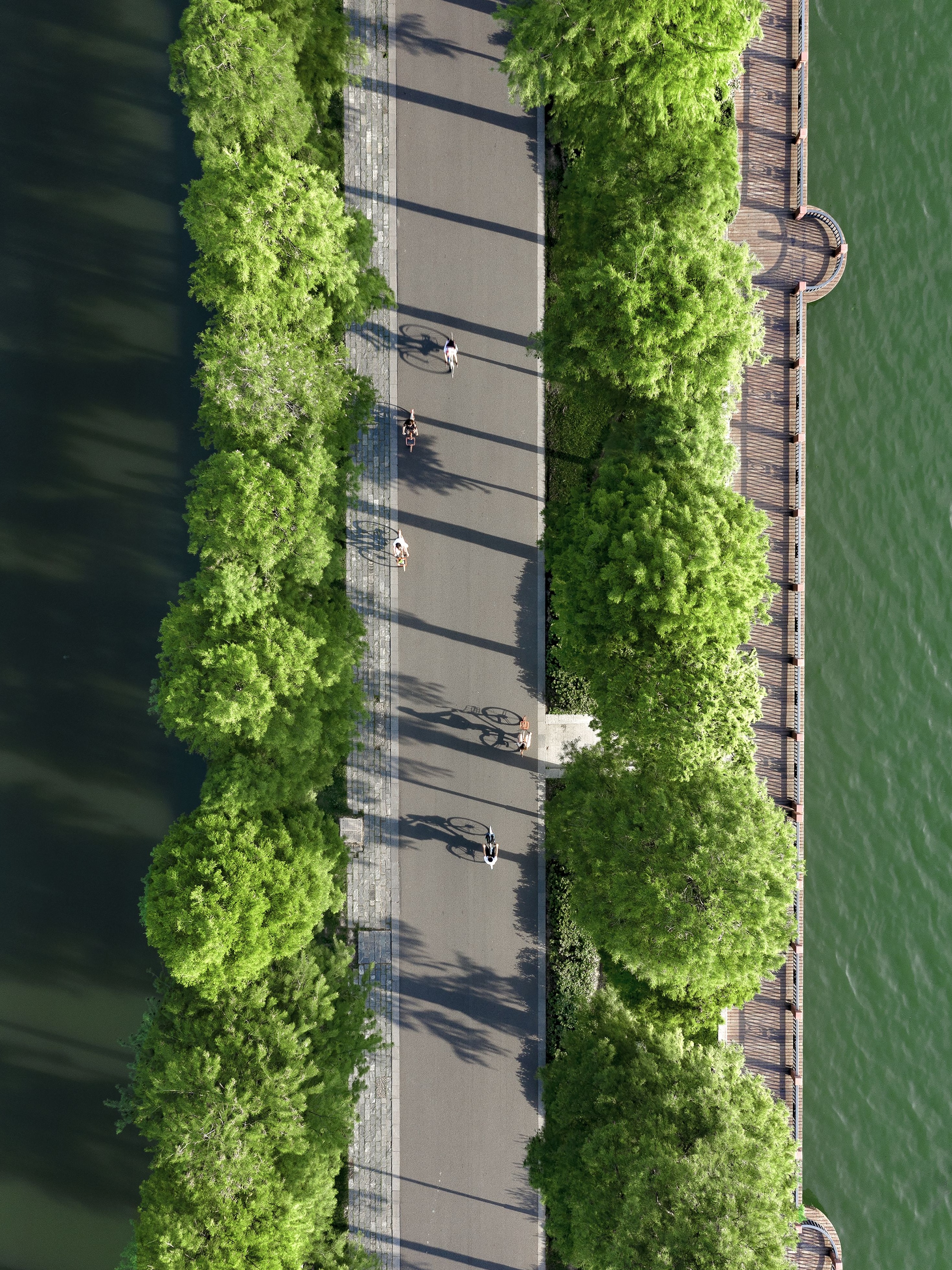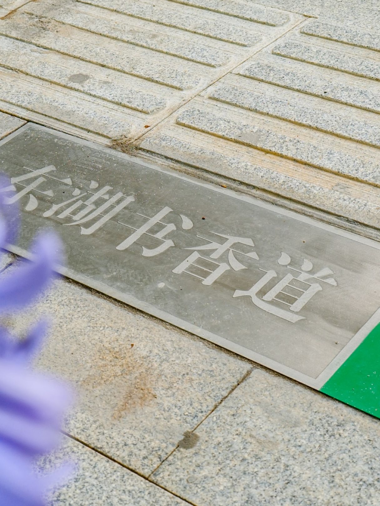 东湖绿道三期的定位是“舒适连续、书香浓郁、疏朗大气、配套完善的文化休闲慢道”。骑车至此、步行至此,铺装上鲜明的“书香绿道”字样,赋予了它在武汉绿道系统里的独特标签。