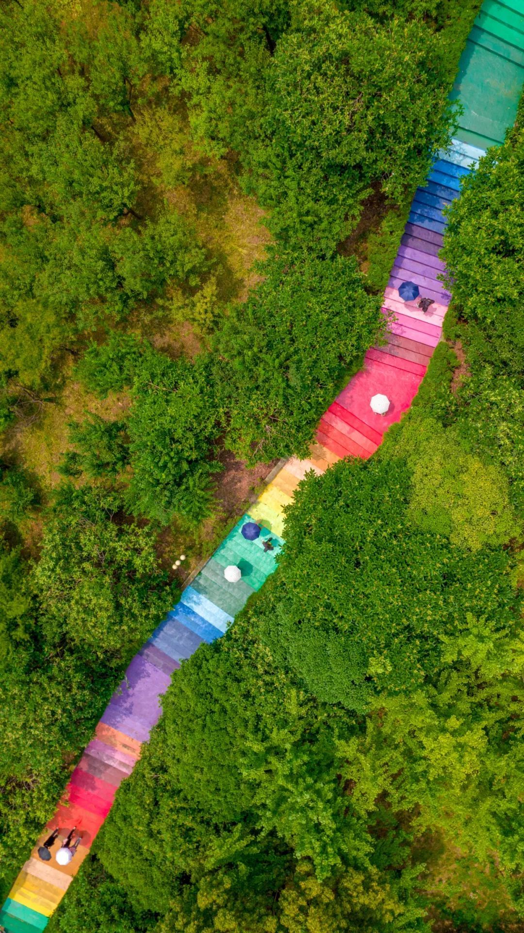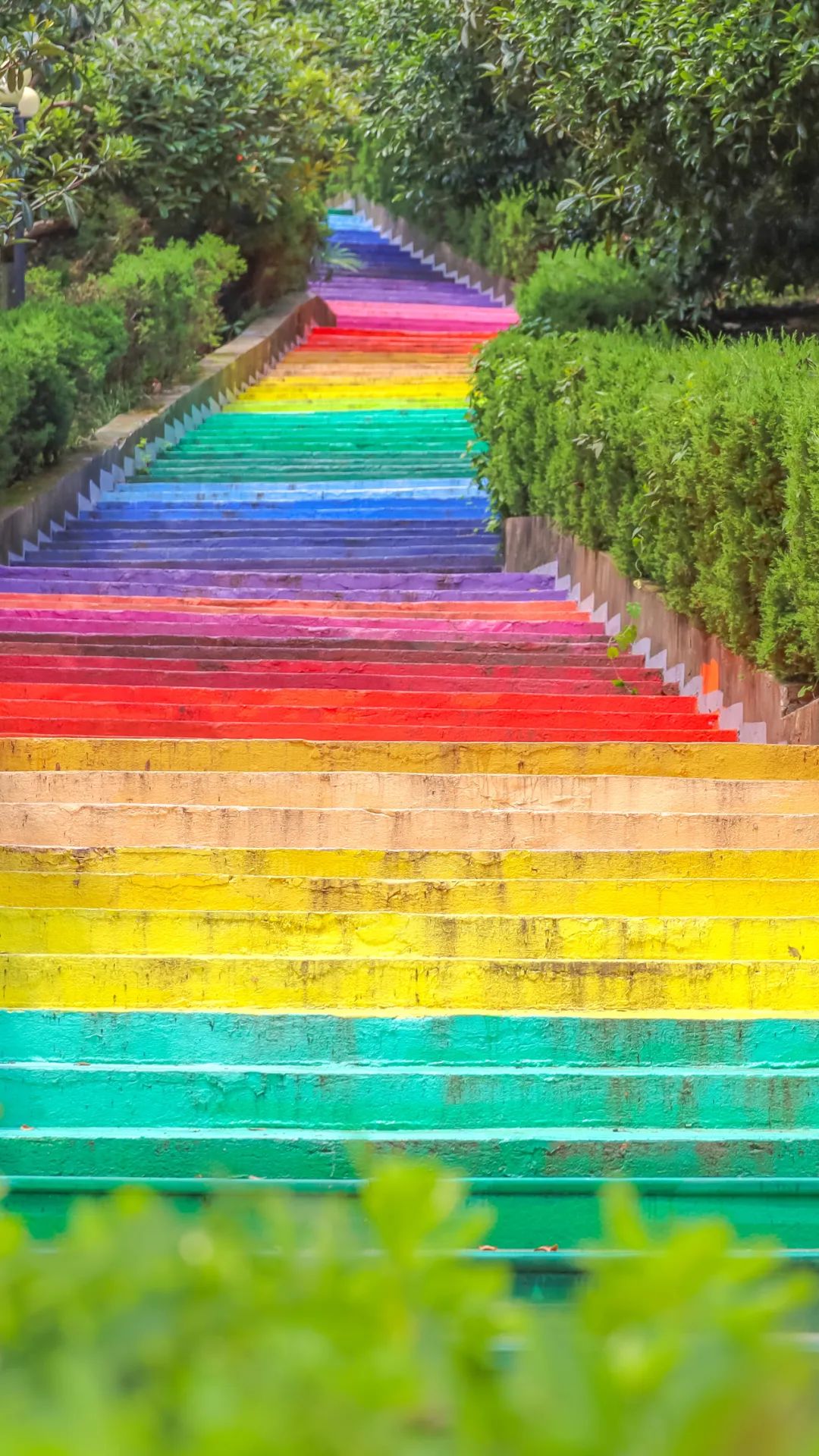 如果大家想去拍照的话,可以带上帽子、书本、雨伞等道具,这样会增加一些俏皮感。我推荐大家上午去拍摄,顺光让画面更好看。大家还可以尝试使用长焦段相机拍摄,会使“彩虹阶梯”更有压缩感。