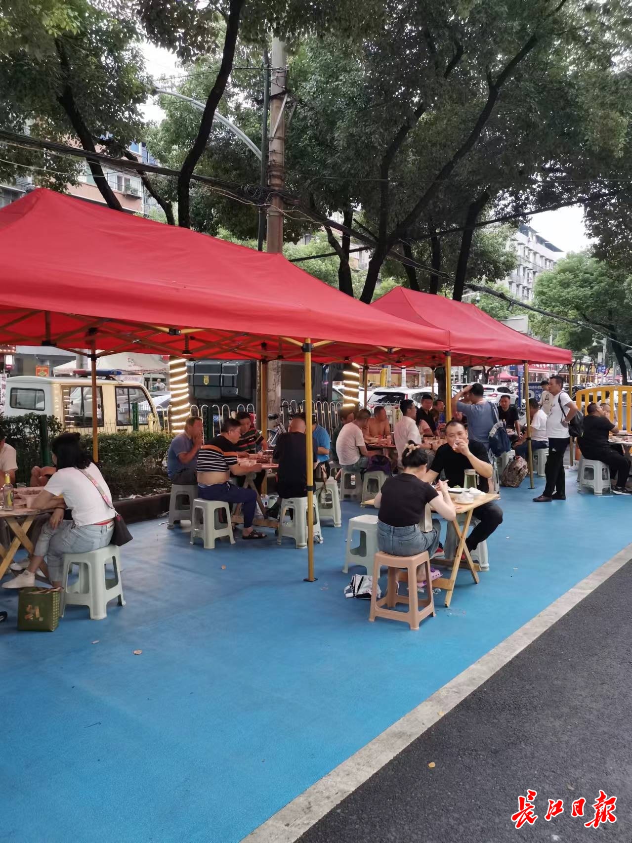 7月13日23时许,汉阳玫瑰街夜市,一块宽约1.8米、长约20米的塑料垫上,十多桌客人正在就餐。老板陈万本一边张罗生意,一边向长江日报记者透露这块塑料垫的妙用:夜市的每家商户各铺一块塑料垫,既防止油污脏了路面,也“框”出经营范围,确保不占道经营。