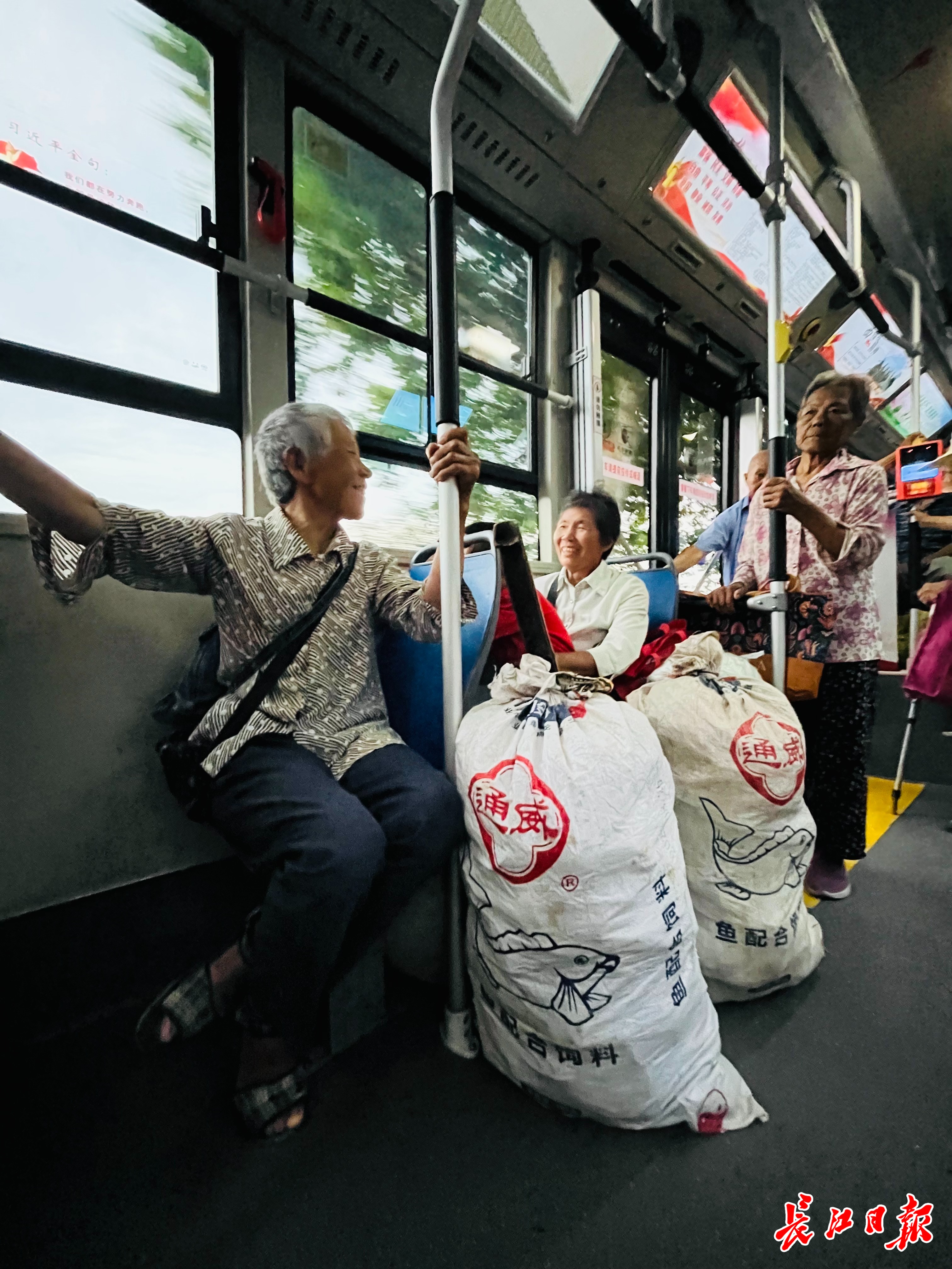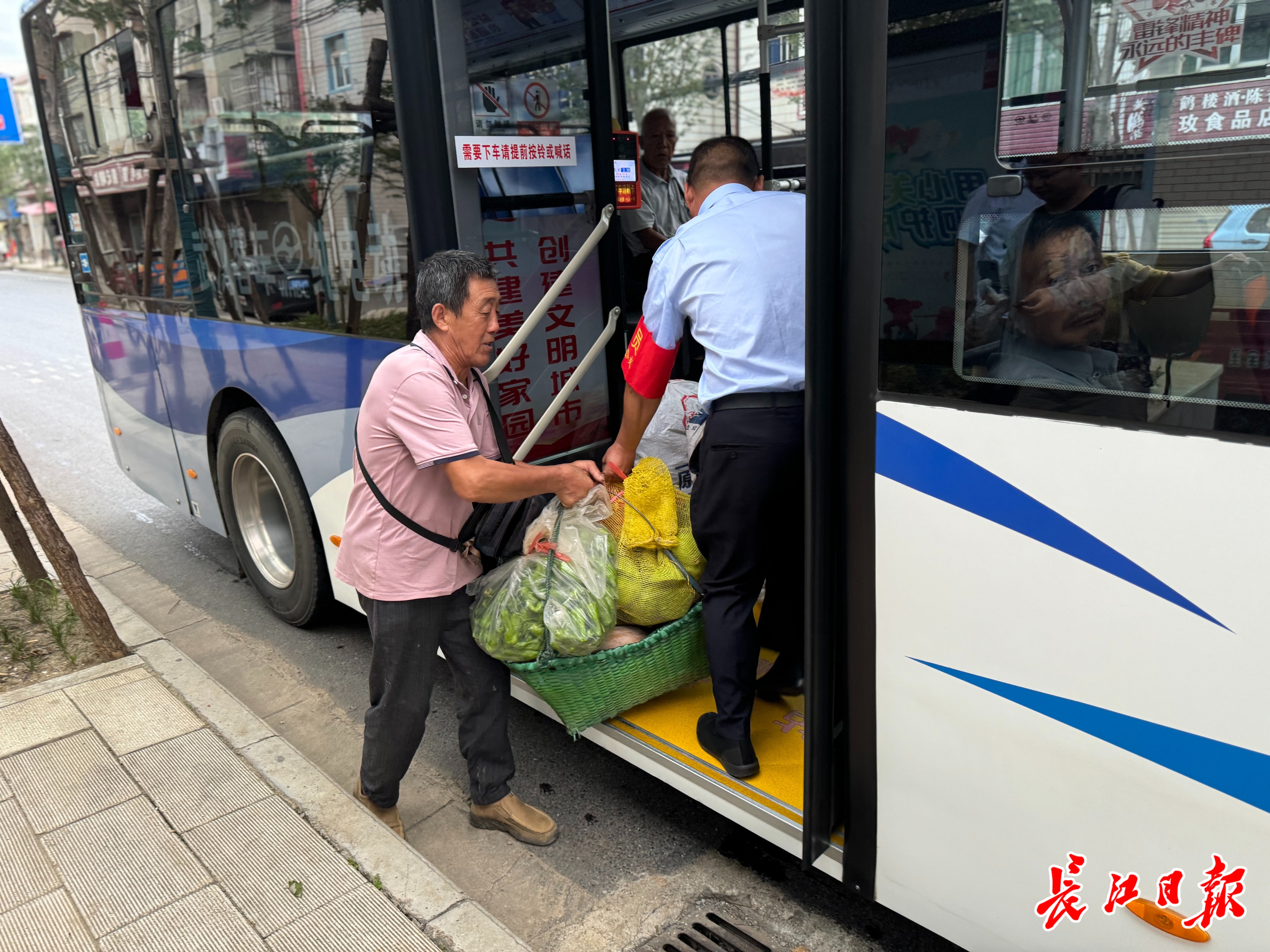 晨光中,不少村民挑着装满各种蔬菜的担子向公交站走来。村民秦时梅挑着两麻袋新鲜莲蓬、一网兜小龙虾,准备去北华街卖菜。见她还牵着小孙子,首班车司机胡四民赶紧下车帮忙。等她安顿好坐下,小孙子熟练地拿着奶奶的爱心卡去刷卡。