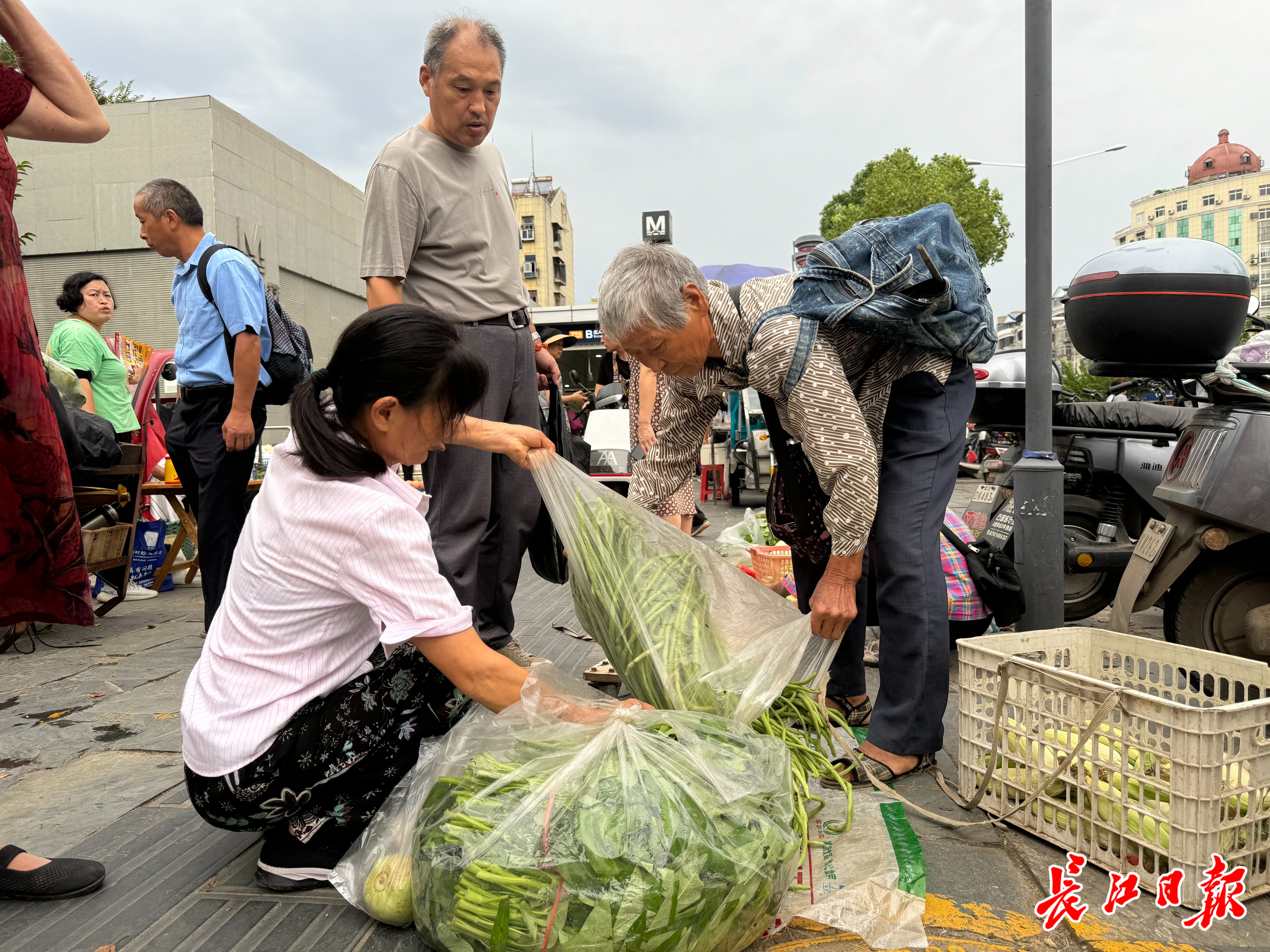 “我经常买她的菜,菜好、新鲜。”市民曹女士从南湖坐地铁赶来,边说边买了一把豆角、一把竹叶菜。