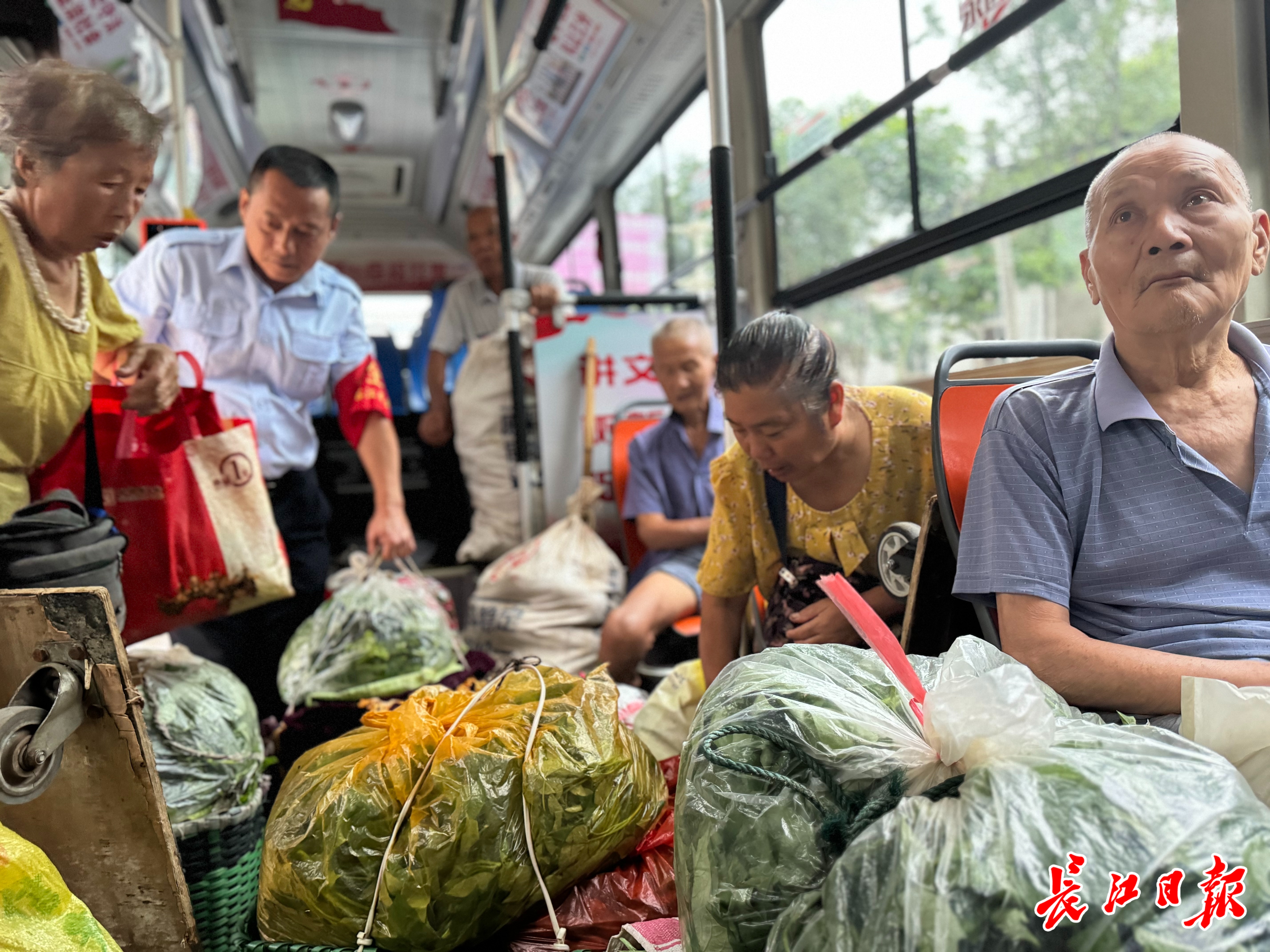 7月24日清晨,在武汉市江夏区的一辆J202路公交上,各式竹篮和编织袋堆满车厢。竹篮和编织袋中装着带着露珠的竹叶菜、鲜嫩的苕尖、翠绿的豆角和饱满的莲蓬,空气中弥漫着蔬菜特有的清新与泥土的芬芳。