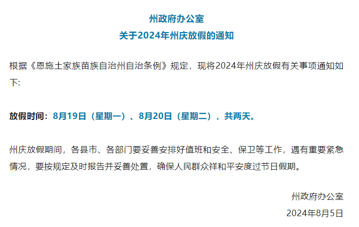 8月5日,湖北省恩施土家族苗族自治州(以下简称“恩施州”)人民政府办公室发布州庆放假通知。
