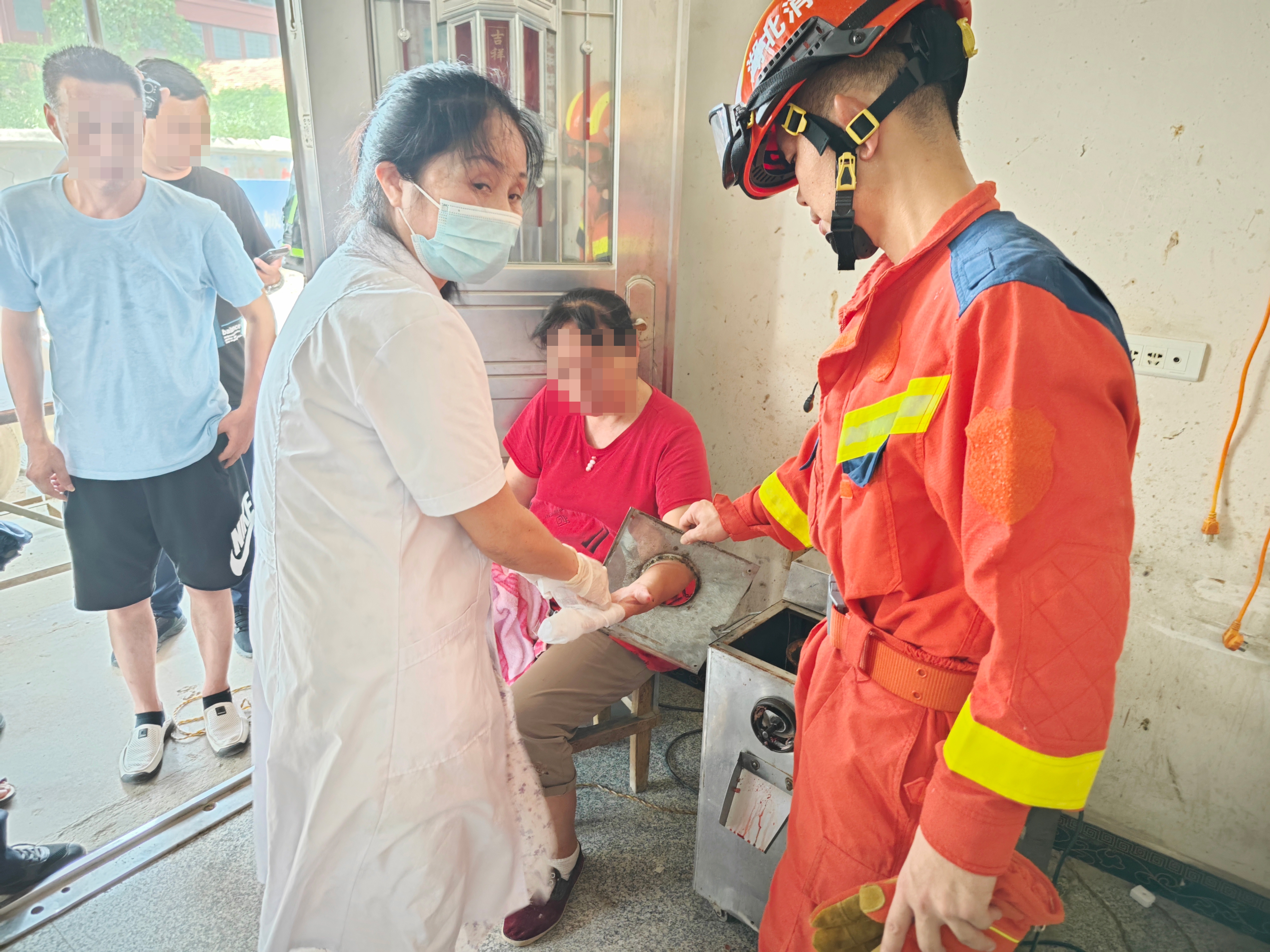 消防员一边安抚女子,一边与现场120医护人员进行沟通,决定先由医护人员对女子手部进行局部麻醉处理,以减轻女子疼痛感;再由两名消防员使用金属锤从绞肉机侧面对滚轮刀轴承进行敲击,扩大滚轮刀轴承与进料口之间的间隙。在间隙被扩大到一定程度后,女子手指被成功取出。随后,现场医护人员给女子受伤的手指进行了包扎处理,并把她送医救治。