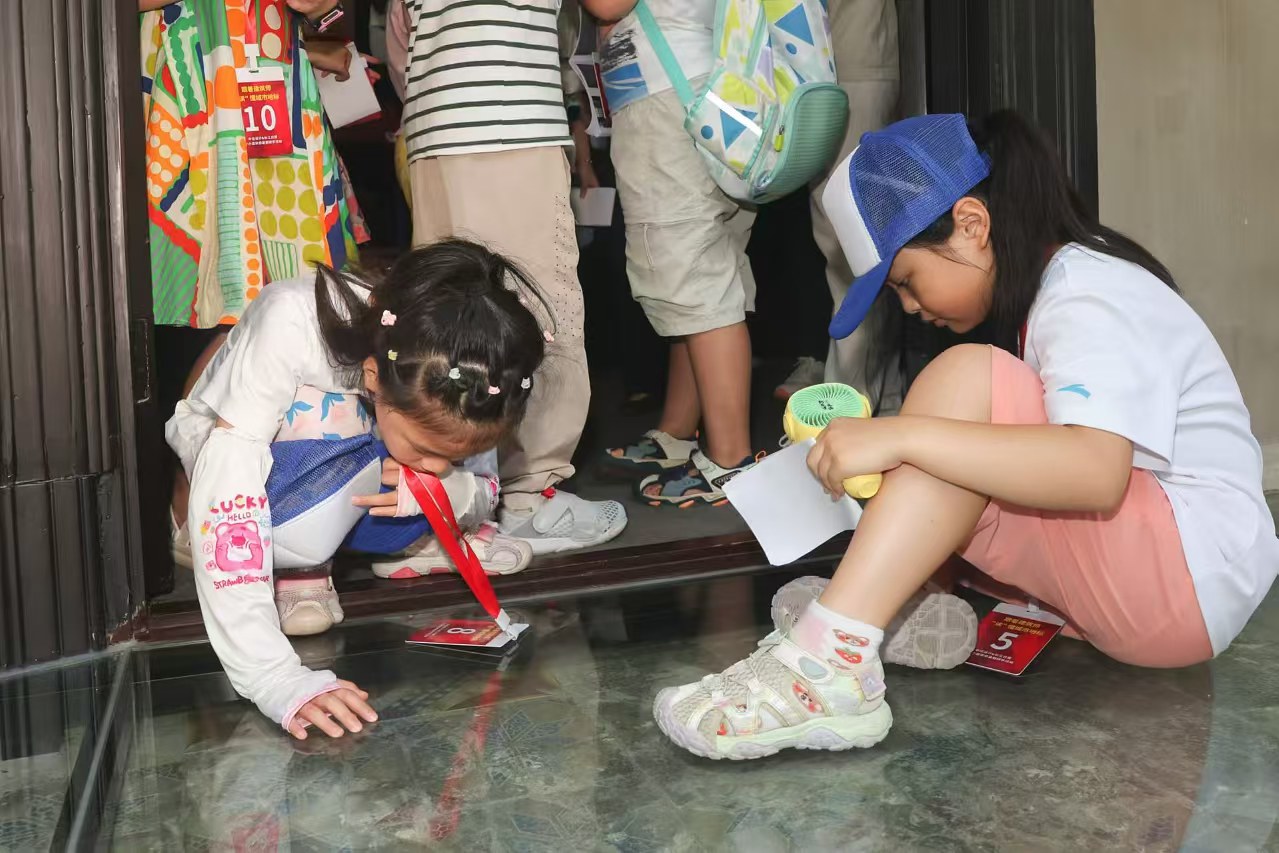 小朋友们蹲在地上观察瓷砖。(图片由通讯员提供)