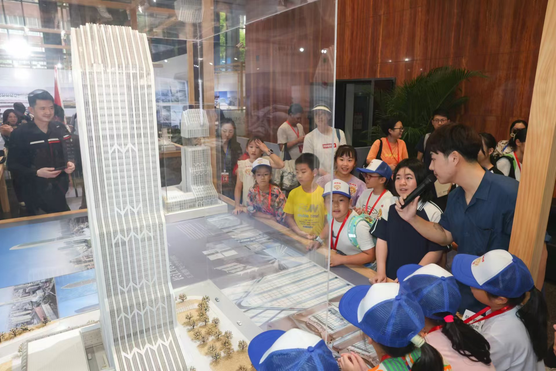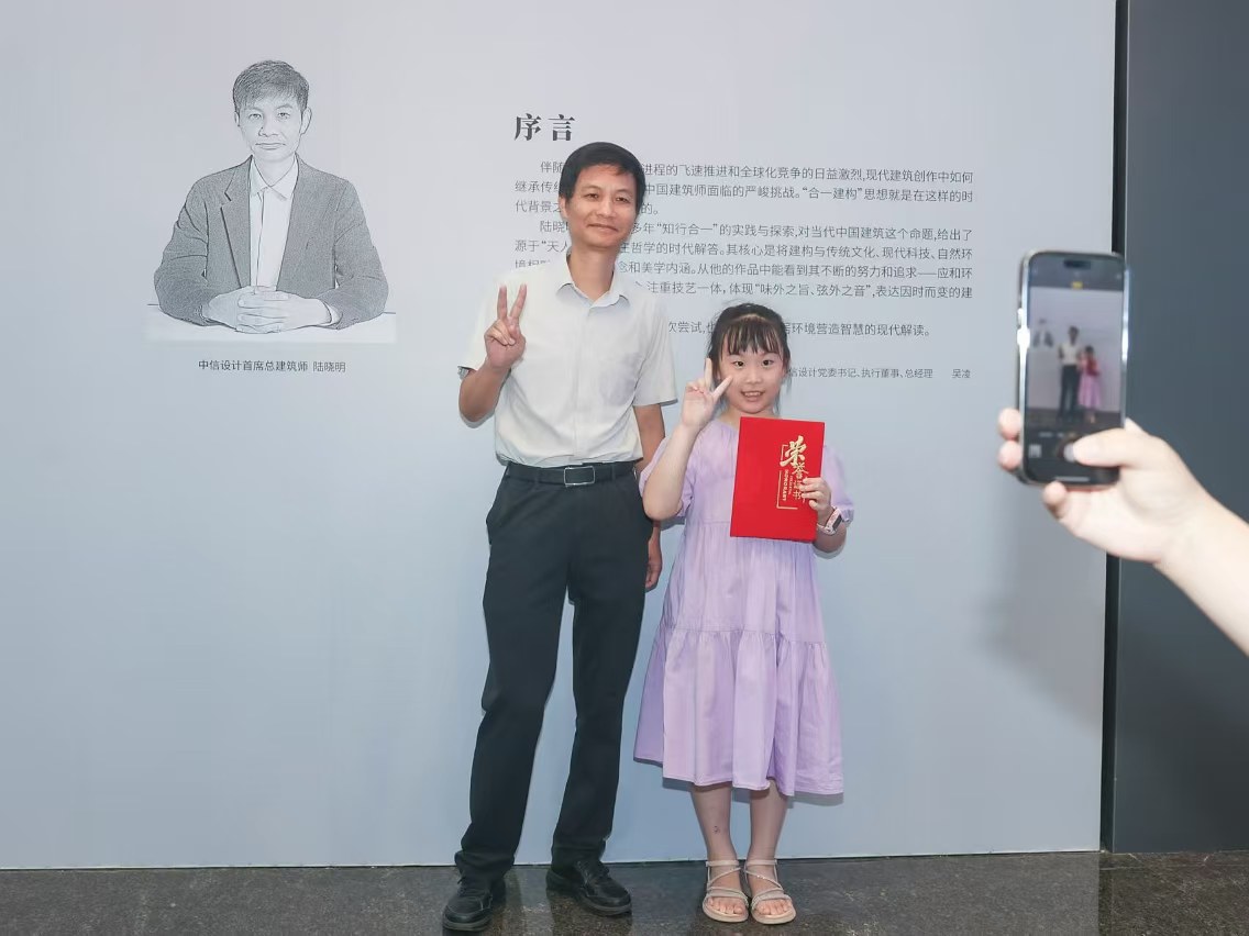 在中信建筑设计研究总院一楼,中信设计第八设计院建筑师王逊现场讲解“合一建构——中信设计首席总建筑师陆晓明当代建筑探索与实践展”,带着孩子们认识更多的武汉知名建筑的故事。“这个大楼像火箭、像笔尖,原来是长江日报的新大楼啊。”“这是我们上次看过的造型像‘簠’的湖北省博物馆新馆。”“快看,这是我经常去的湖北省图书馆!”……匠心的设计、专业的讲解,让孩子们发出阵阵感叹。
