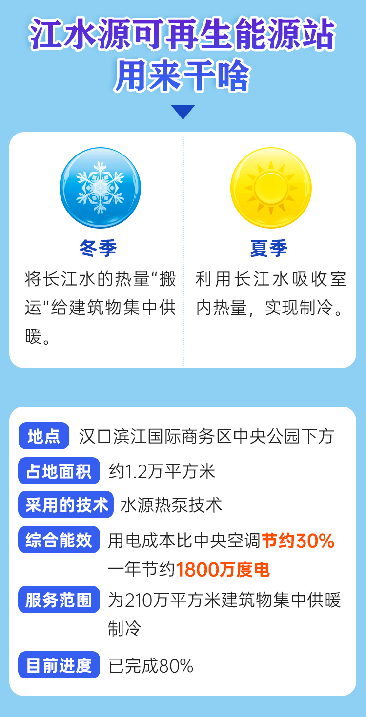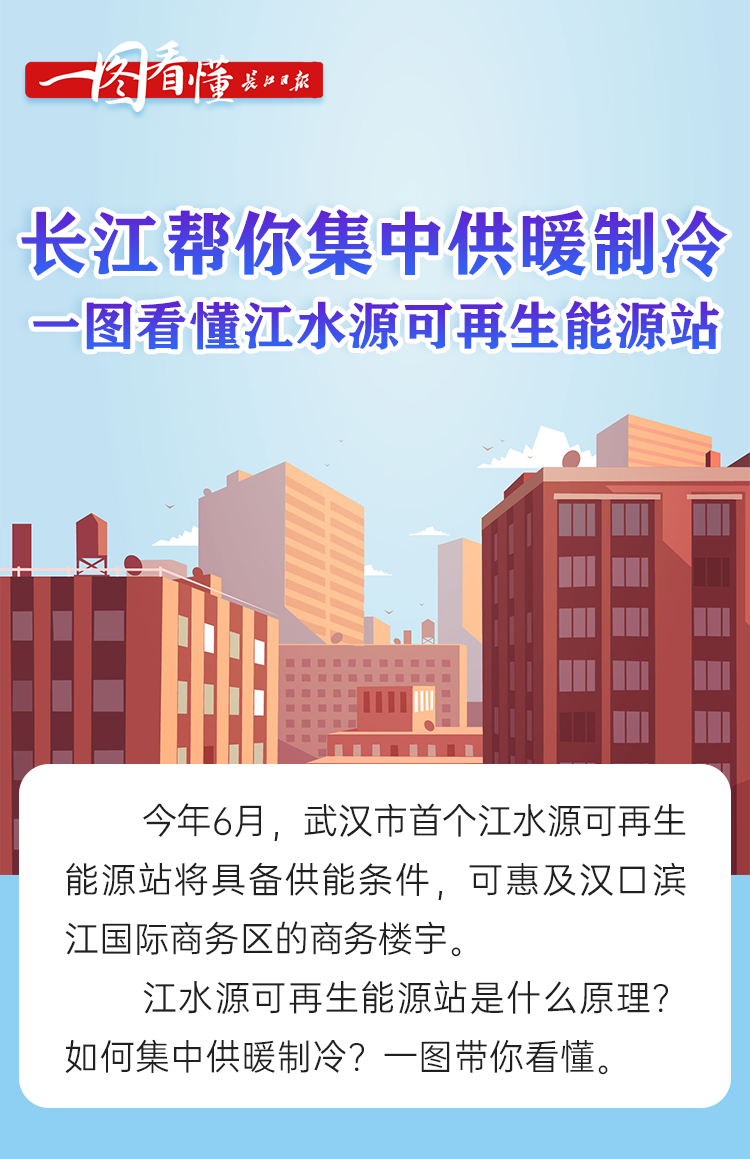 长江日报大武汉客户端3月10日讯(见习记者汪丽婷 通讯员周茜茜)冬季,将长江水的热量“搬运”给建筑物集中供暖;夏季,利用长江水吸收室内热量,实现制冷……今年6月,武汉市首个江水源可再生能源站将具备供能条件,可惠及汉口滨江国际商务区的商务楼宇。