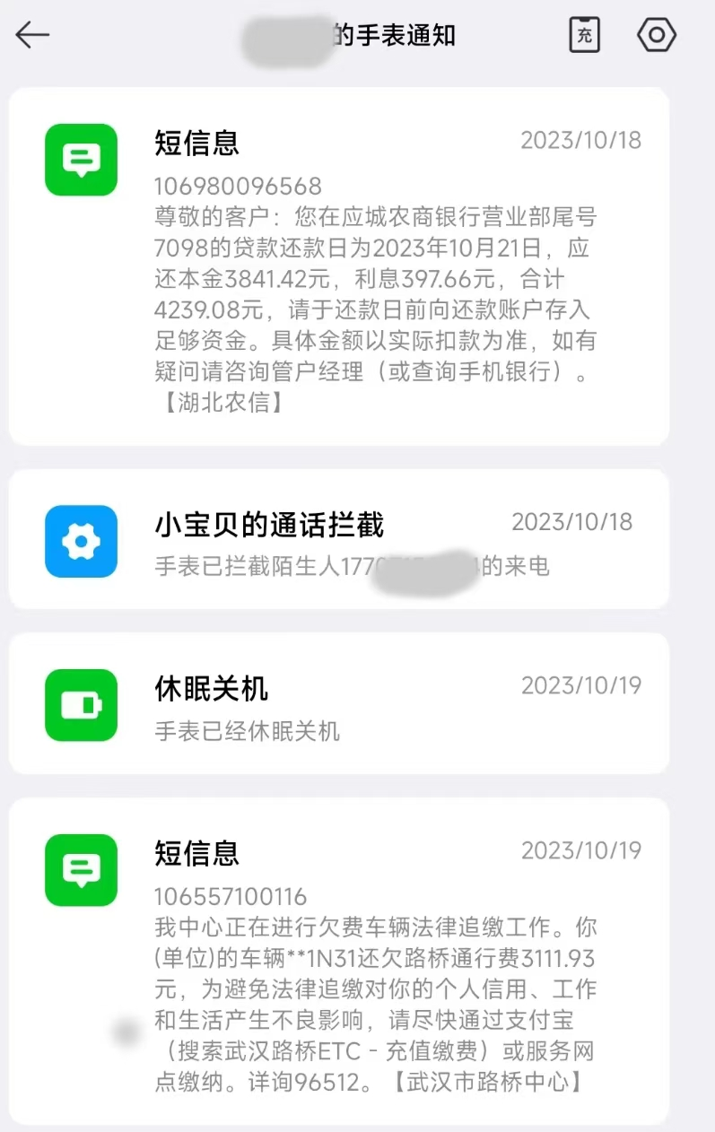 去年,王女士给8岁的儿子买了一个电话手表。“不到一个月,电话手表就收到了来自应城农商行的贷款催缴短信和武汉市路桥中心的路桥通行费催缴短信。”王女士告诉记者,看到催款短信时,自己感到可气又可笑。