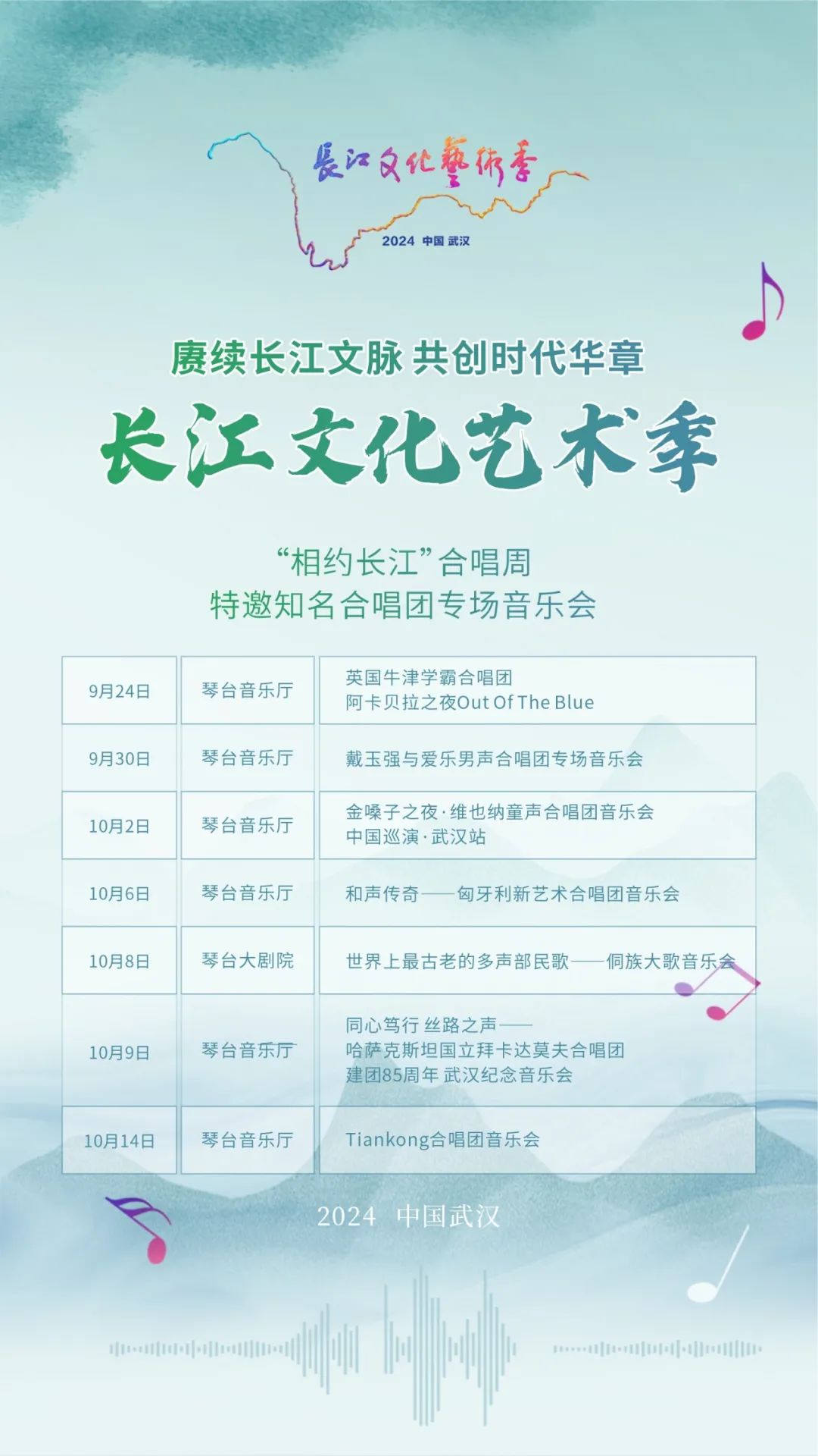 相约长江,共享天籁。长江文化艺术季——“相约长江”合唱周将于9月24日至10月14日在武汉举办,本次活动由文化和旅游部艺术司、公共服务司,中共湖北省委宣传部,湖北省文化和旅游厅主办,旨在唱响时代旋律,传播中国声音,生动展示长江文化精神内涵。合唱周特别邀请了7家国际、国内知名专业合唱团体,为观众带来跨越国界、跨越流域的高品质专场音乐会。