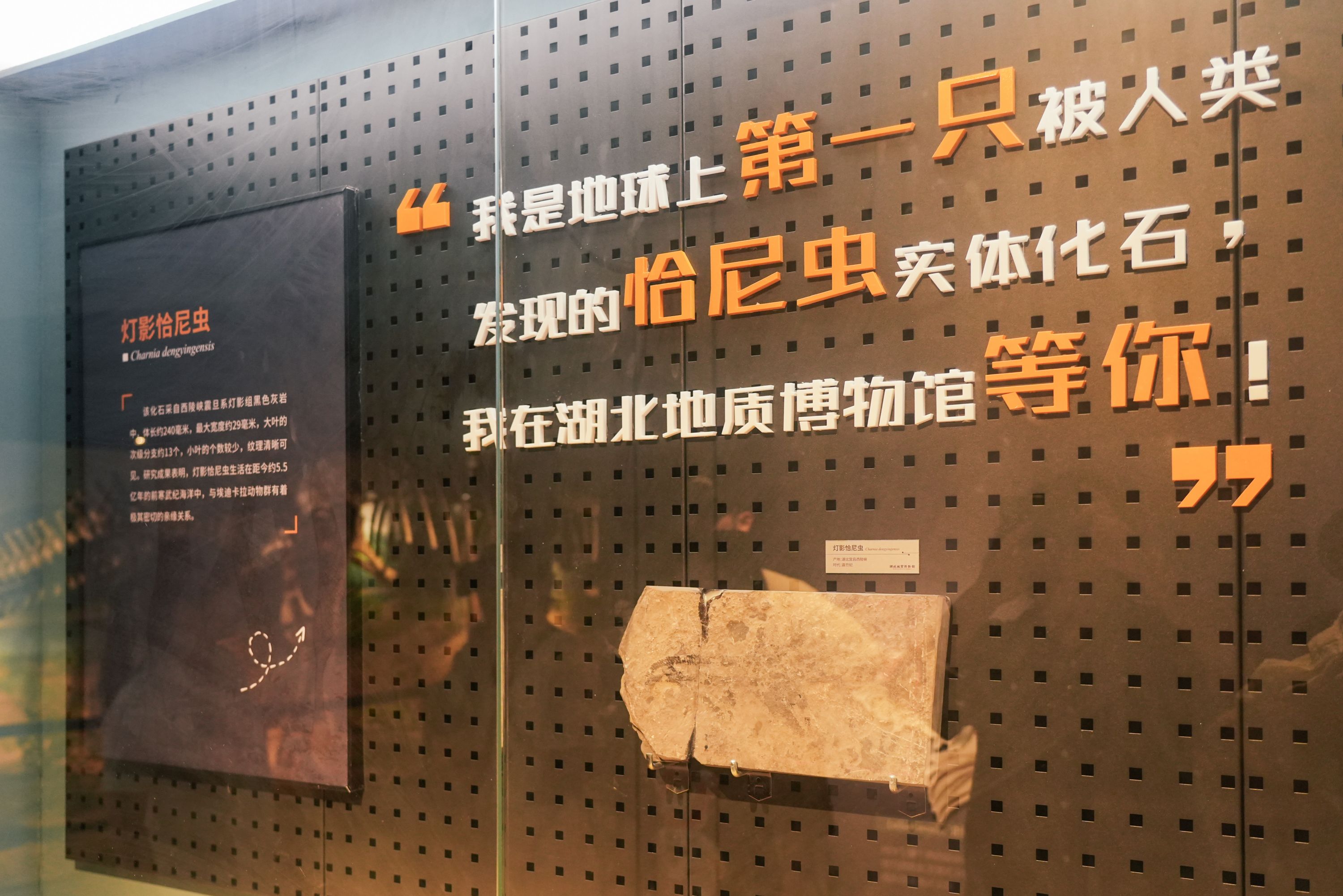 拐进生命演化厅,可以看到地球上第一块被人类发现的“灯影恰尼虫”实体化石,这也是镇馆之宝。灯影恰尼虫,属于前寒武纪(距今约5.5亿年)埃迪卡拉动物群的重要属种,是湖北省地质科学研究所丁启秀研究员1978年发现于宜昌西陵峡南岸的石板滩。这是全球首次发现的一块“恰尼虫”实体化石,也是中国第一件“埃迪卡拉生物群”化石,在华夏大地开启了探索寒武纪大爆发以前生命世界的新篇章。刘鸿飞介绍,恰尼虫作为一种5.5亿年前远古海洋中的生命体,代表着地球上最早期的多细胞生命的记忆。在亿万年后的今天,恰尼虫以化石的形式“重见天日”,对我们认识地球生命的演化具有非常重要的科学意义。