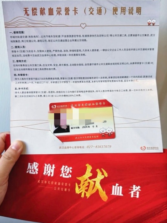 10月5日,市民李斌(化名)在武汉城市留言板留言,他无偿献血超过1000毫升。依据武汉市无偿献血的“四免”政策,他通过“武汉血液中心”微信公众号领取了武汉市无偿献血荣誉卡(景区)。按照规定,他可免费游览市、区所属公园和政府投资主办的景区等场所。