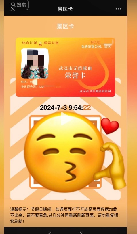 通过“武汉血液中心”公众号领取电子版“景区卡”,上面有头像和身份证信息。