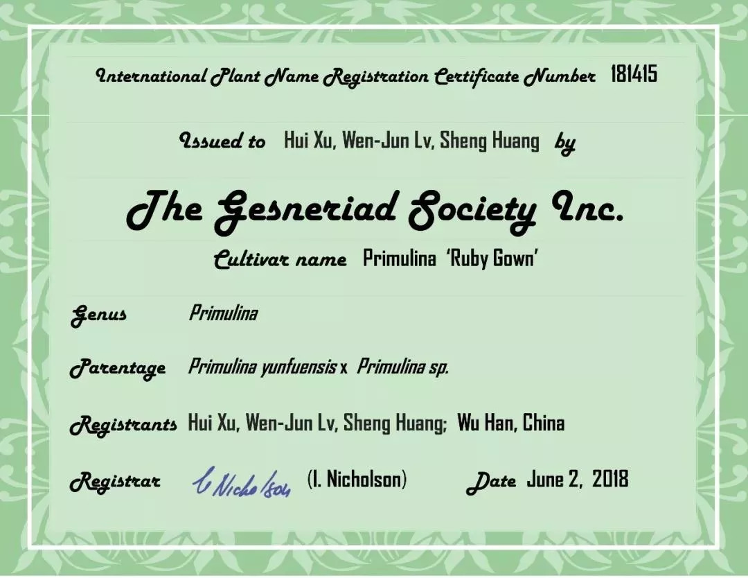 继今年5月,市园林科研院园林植物研究所高级工程师徐慧研究的苦苣苔科花卉品种Primulina'Silver Antler'成功在美国完成国际登录后,8月25日,经官方信息确认,徐慧再接再厉完成两个苦苣苔科新品种“RubyGown”、“Pink Beauty”的国际登录,这是45年来市园林科研院在诞生第一个国际认可的新品种后,短短几个月时间又一次在园林植物——苦苣苔科花卉新品种研究领域取得的重大突破性进展!