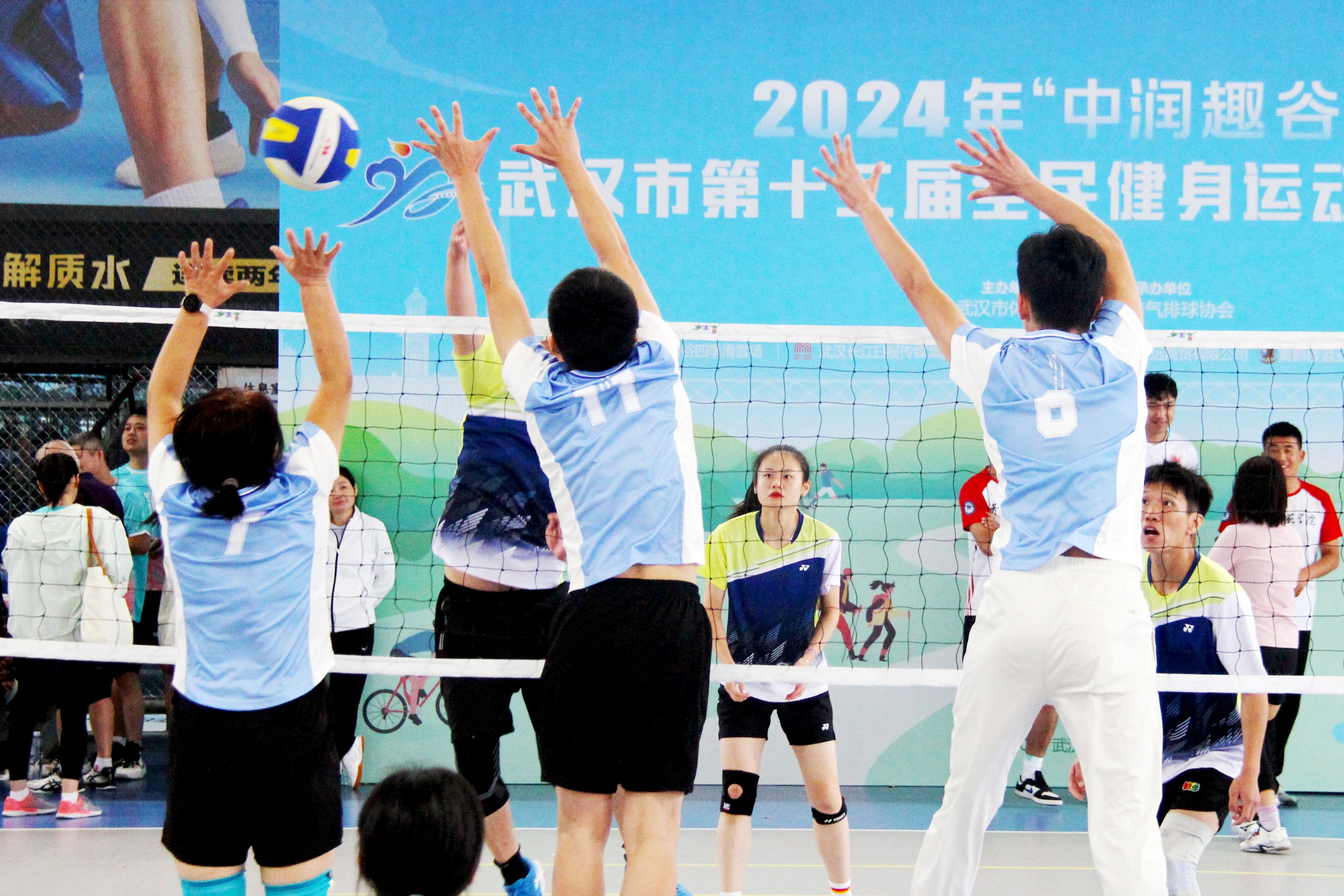 大力扣球、三人拦网、鱼跃救球、清脆的哨声、此起彼伏的呐喊声……19日,塔子湖体育公园篮球馆内,2024年“中润趣谷杯”武汉市第十二届全民健身运动会气排球比赛如火如荼地进行。