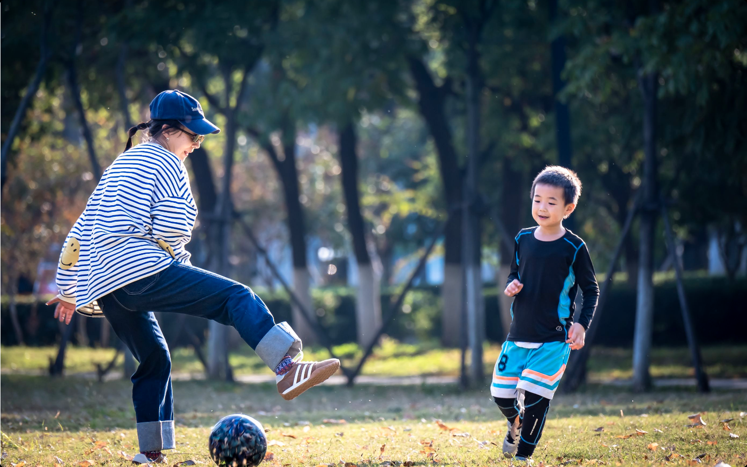 在武昌江滩,一位妈妈正陪着儿子踢足球,她的动作熟练而漂亮,显然担任陪练已有不少年头。